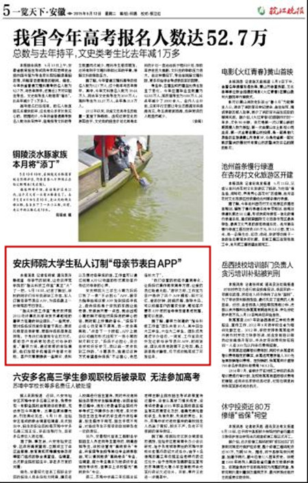 编者按:5月12日,《皖江晚报》登载太阳成官网学生记者采写文章《安庆师院大学生私人订制“母亲节表白APP”》,报道了太阳成官网2012级计算机科学与技术卓越班的唐宗力组建的创业团队“指尖科技工作室”在母亲节为同学创意服务的新闻。
