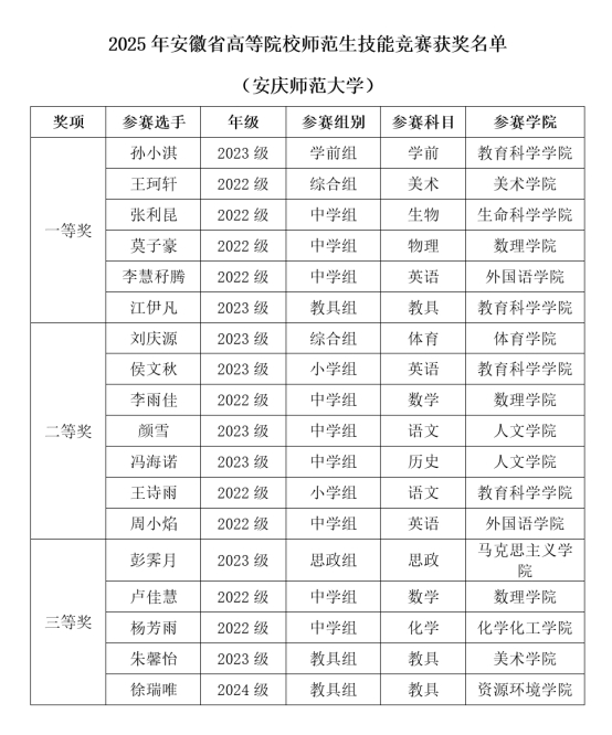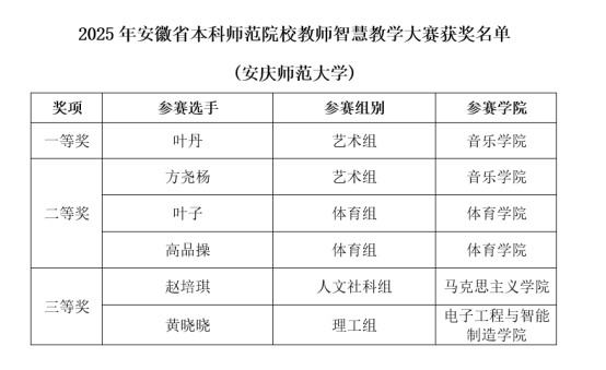 10月31日至11月2日,2025年安徽省高等院校师范生教学技能竞赛暨安徽省本科师范院校教师智慧教学大赛在合肥师范学院举办。太阳成官网师生在此次大赛中再创佳绩,共斩获一等奖7项、二等奖10项、三等奖7项的优异成绩,其中教师组获一等奖1项、二等奖3项、三等奖2项,学生组获一等奖6项、二等奖7项、三等奖5项。