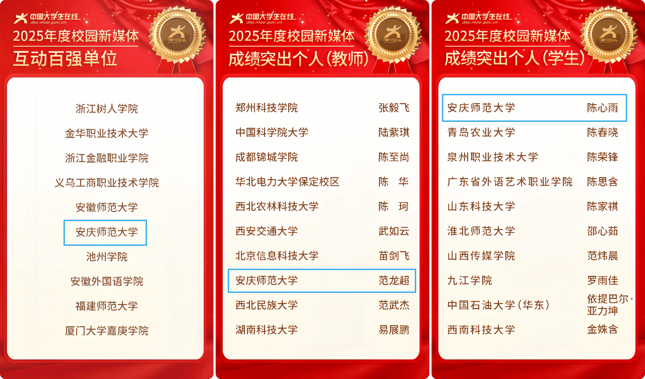 近日,教育部中国大学生在线公布2025年度校园新媒体融合共建表彰名单,学校再次获评“校园新媒体互动百强单位”,1名教师获评“成绩突出个人(教师)”,1名学生获评“成绩突出个人(学生)”,这是学校连续6年获该平台表彰。