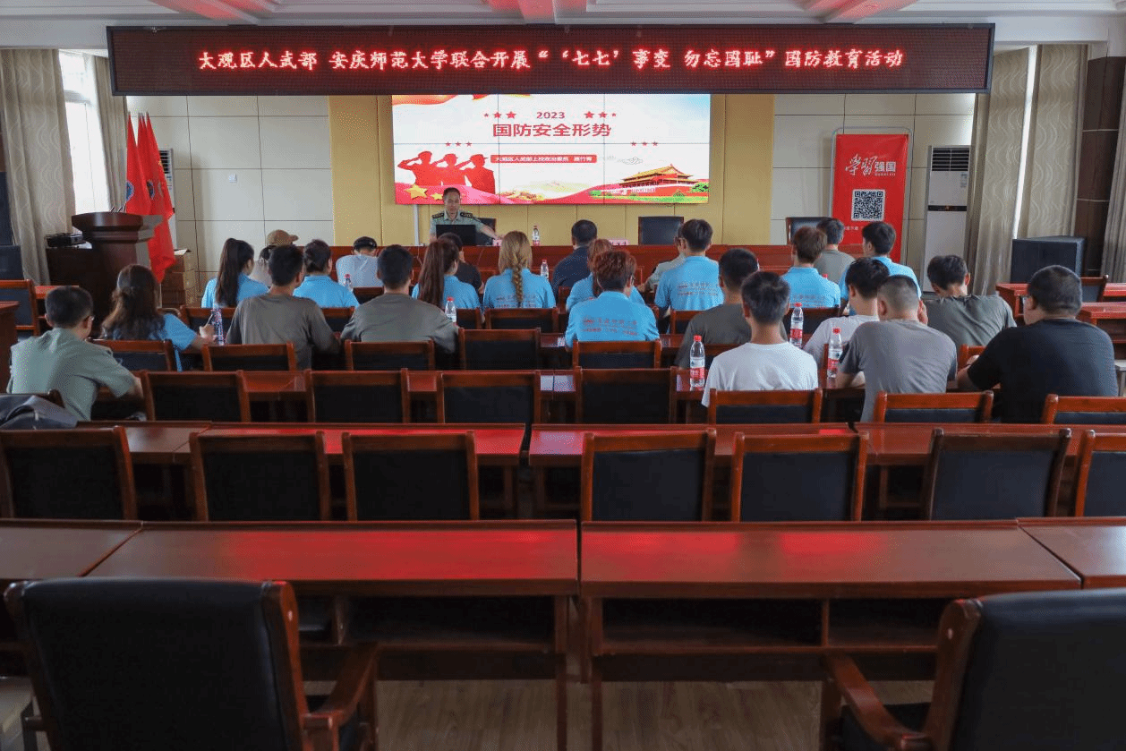 “青年学子应当厚植家国情怀,勿忘国耻,以奋斗姿态激扬青春,不负时代!”7月7日,时逢“卢沟桥事变“86周年,体育学院“舞动青春 志愿家乡”乡村振兴暑期社会实践团及“火热青春壮志报国”退役军人暑期社会实践团赴安庆市大观区同上纪念全民族抗战爆发86周年主题国防教育课,成员们协同9名乡镇街道秋季应征入伍青年,共同追寻红色足迹,汲取奋进力量。