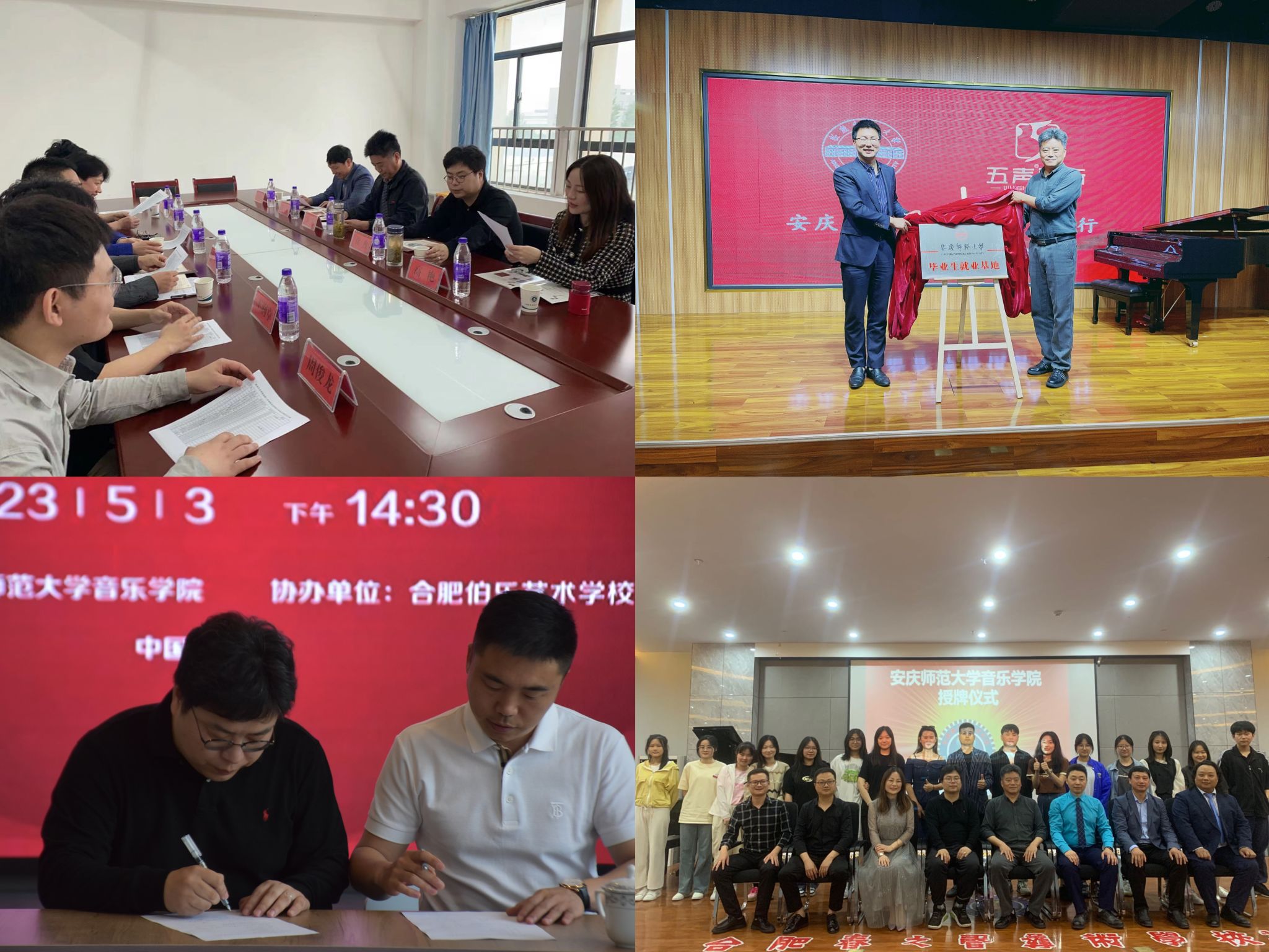日前,音乐学院党委书记张铭,副院长徐冉、高艳,副书记肖之进等赴合肥访企拓岗,与用人单位签订毕业生就业基地合作协议并挂牌。访企拓岗期间召开了合肥市校友代表座谈会,开展音乐学专业人才培养方案专题调研。