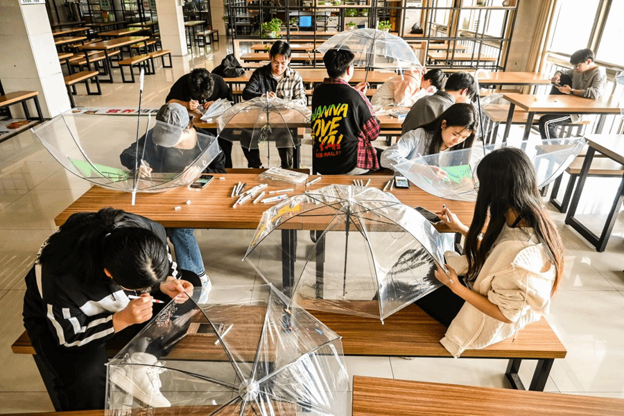 同学们围坐在一起,撑开雨伞,拿起画笔,绘制各式图案,并涂上自己喜欢的色彩,朵朵绚丽的“鲜花”在同学们的手中绽放。彩虹弯弯,色彩鲜艳;点点雏菊,小巧淡雅;郁金香花丛,繁茂生机;小兔子、大熊猫等一系列卡通人物,活泼可爱……在创作的过程中,同学们不时互相交流着绘画的心得,欣赏彼此的画作。同学们还在雨伞上写下美好寄语,表达对生活和学习的勉励与鼓舞。
