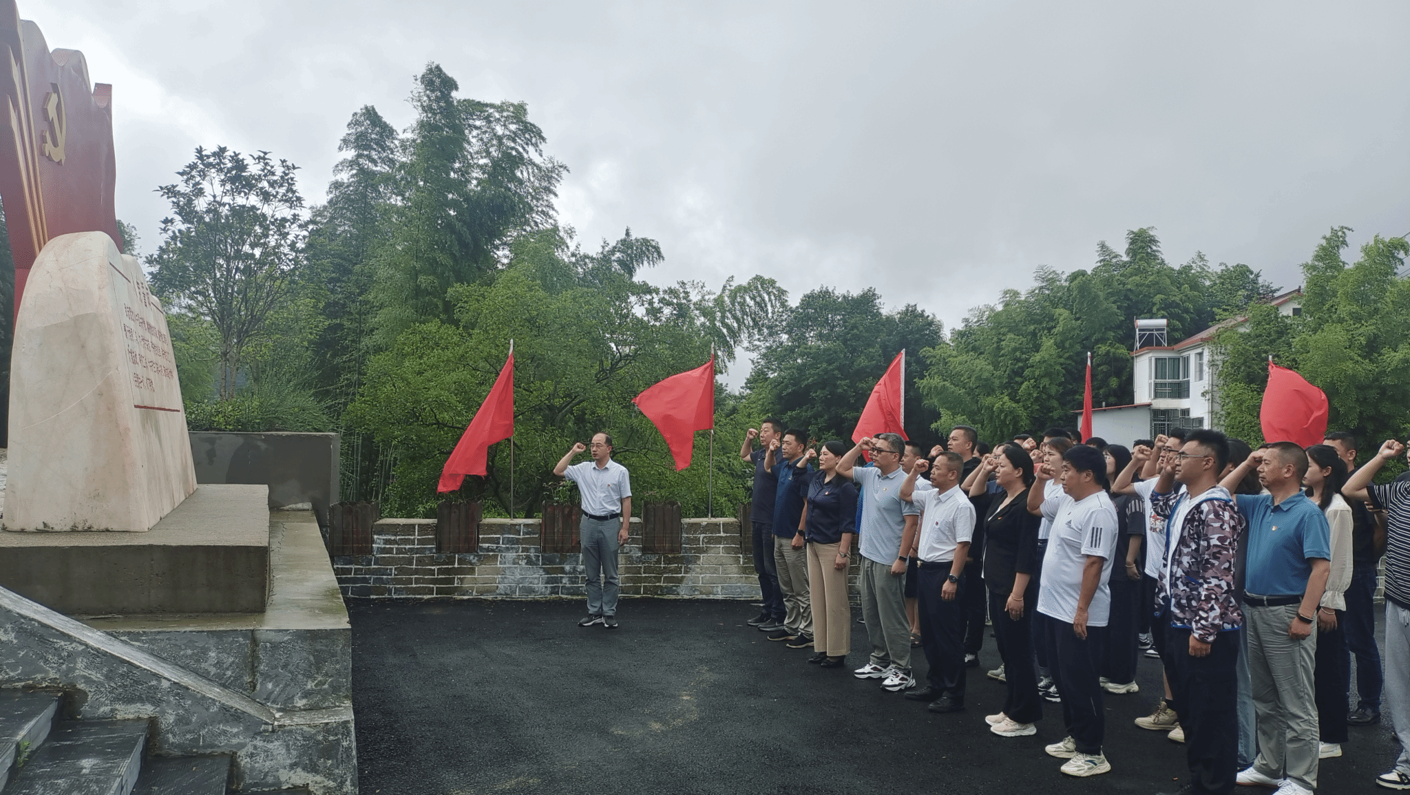 在革命遗址前的广场上,学院党委副书记、纪委书记王玮带领大家怀着无限崇敬的心情,面向鲜红的党旗,庄重地紧握右拳,一字一句、铿锵有力地重温入党誓词,进一步不忘初心、牢记使命。