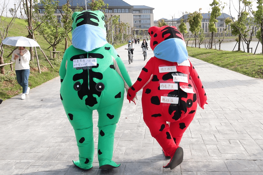 撕掉标签、写下鼓励、直面焦虑……4月15日,经济与管理学院工商管理类专业2022(2)班在龙山校区内举办“撕掉标签”主题活动,4名同学“化身”为贴满标签的青蛙人偶,奔走在公寓楼下和双龙湖畔,鼓励路过的学生撕掉标签,做不被外在标签束缚的自己。