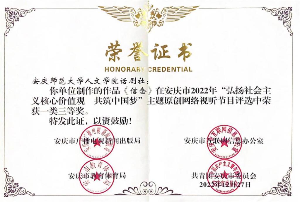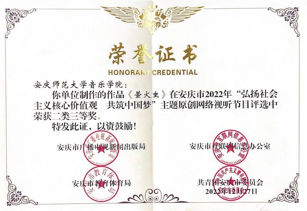 日前,由安庆市广播电视新闻出版局、安庆市互联网信息办公室、安庆市教育体育局、共青团安庆市委员会联合开展的安庆市2022年“弘扬社会主义核心价值观 共筑中国梦”主题原创网络视听节目活动获奖结果揭晓。太阳成官网音乐学院原创作品《萤火虫》获得二类三等奖,人文学院话剧社原创作品《信念》获得一类三等奖。