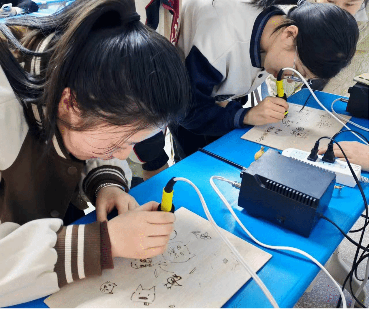 观摩完大师级的优秀作品后,现场参与学生纷纷表示“跃跃欲试”,黄常薇拿起电烙笔,选择好图案,一笔一划地在木板上进行创作,“我觉得烙画很有趣,没想到自己也能亲身体验非遗文化的奥妙。”她表示,通过参与活动,自己“收获满满”,不仅尝试了新事物,更了解了很多与烙画相关的知识,丰富了自己的知识储备库,为自己日后的学习创作奠定基础。