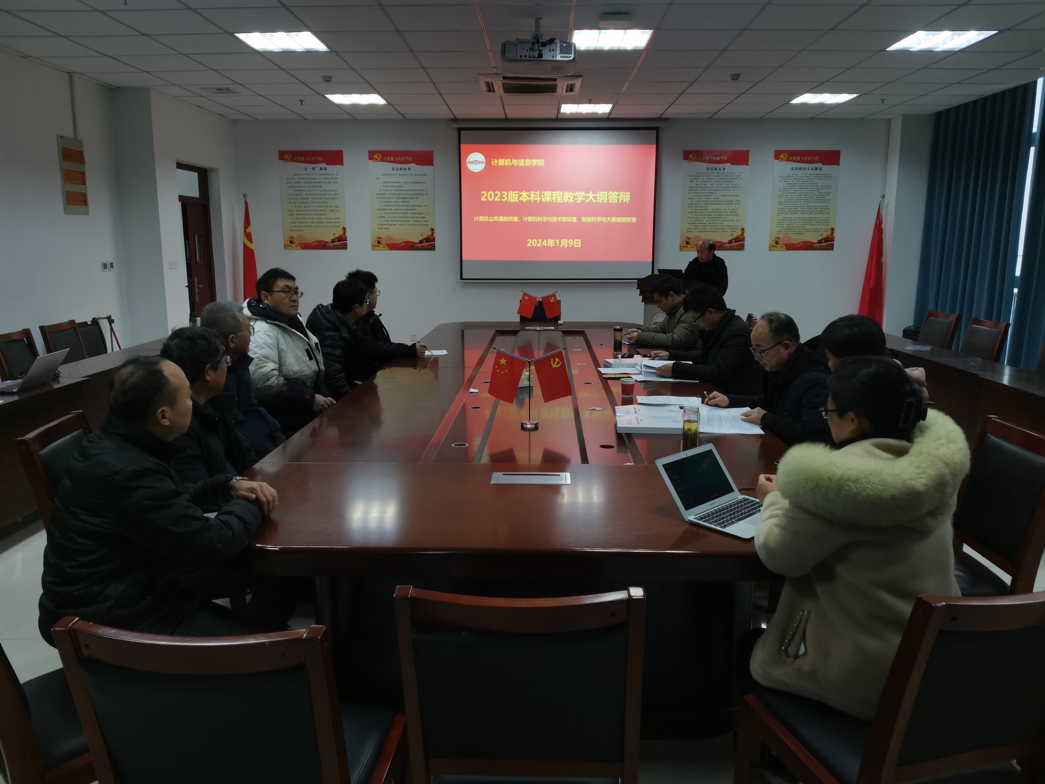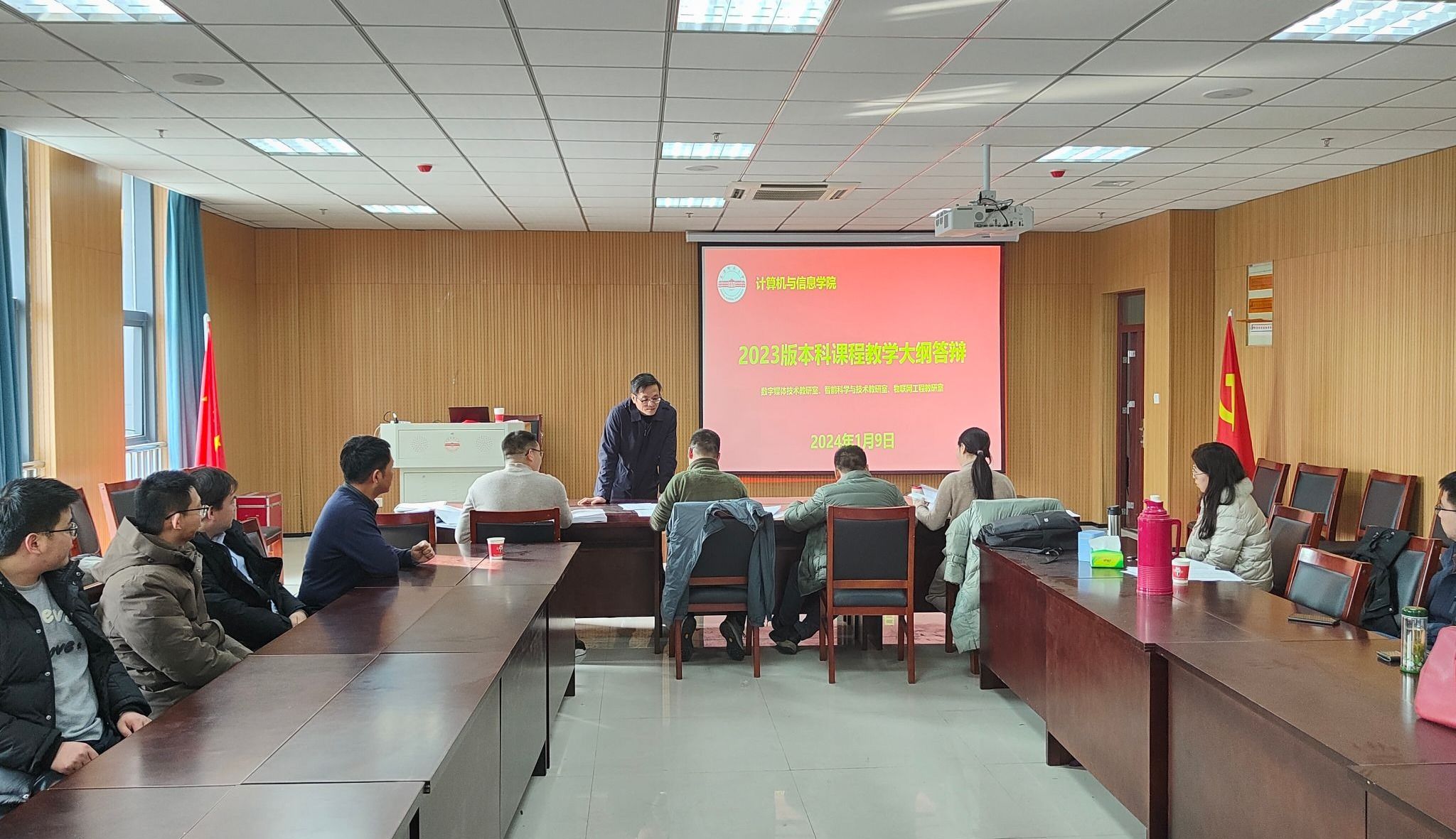 计算机公共课教研室、计算机科学与技术教研室和数据科学与大数据教研室安排在L318会议室参加第一组答辩,数字媒体技术教研室、智能科学与技术教研室和物联网工程教研室安排在L302参加第二组答辩。各教学大纲执笔人现场汇报了本课程2023版教学大纲的编制情况,主要包括课程目标设定、课程目标与毕业要求对应关系、教学内容支撑课程目标、教学方式、考核方式、课程目标达成度评价、课程思政等内容。答辩专家针对答辩过程中出现的问题提出了修改意见与建议。