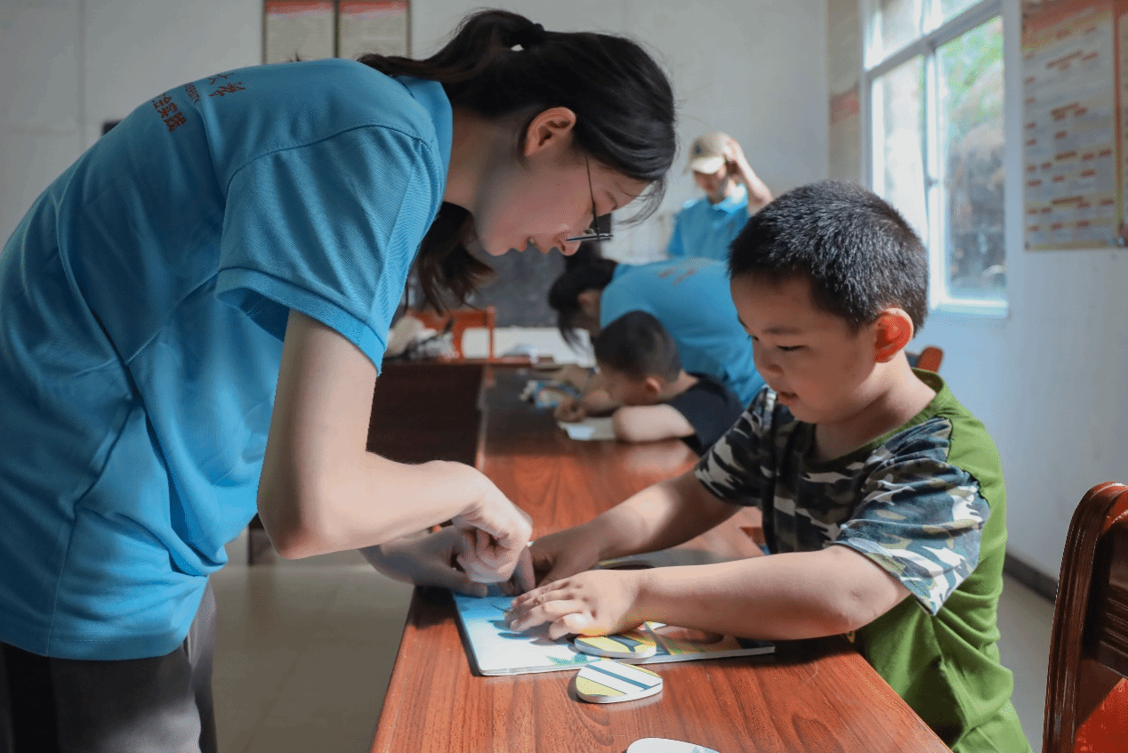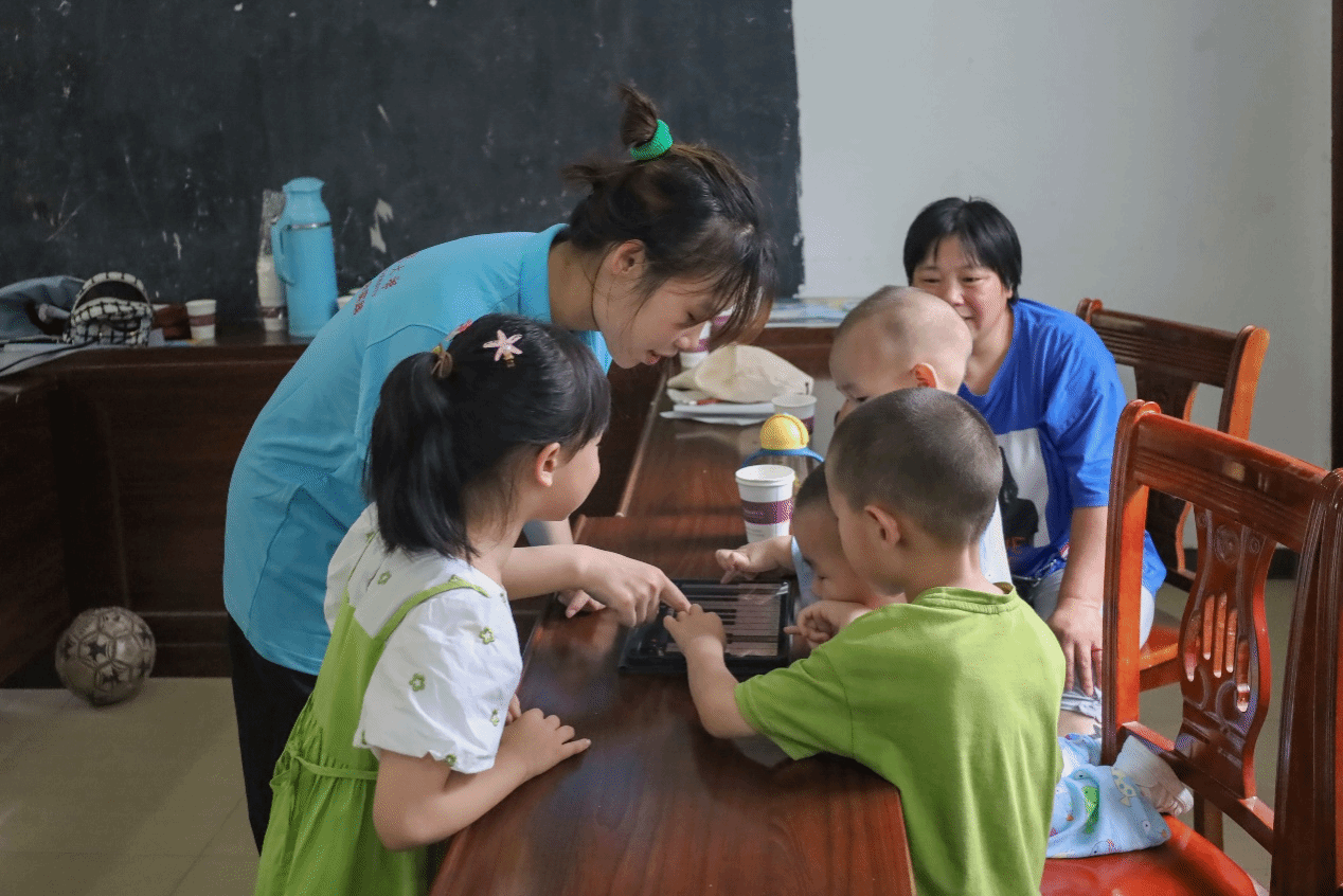 团队成员在出发支教前,制定了一版既能发挥专业优势、又符合乡村实际的特色课程表。考虑到学段差异,对于五年级及以上儿童,成员们主要进行暑期课业辅导;对于幼儿园至五年级的儿童,则以舞蹈、音乐、折纸等趣味课程为主。耐心细致的教学和丰富的特色课程,吸引了不少村民将自家儿童送来上课。支教的第一天只有零星几位小朋友,但随着课程逐步开展,到支教中后期,听课教室已经坐得满满当当。