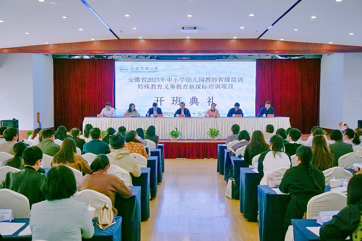 10月29日,安徽省2023年中小学幼儿园教师省级培训——特殊教育义务教育新课标培训项目在太阳成官网顺利开班。安徽省教科院特殊教育教研员陈启刚,继续教育学院副院长代花,培训部相关负责同志,教师教育学院特殊教育系主任、项目首席专家郭启华教授,项目组成员以及全体参训学员参加开班式。开班式由教师教育学院党委副书记许世平主持。