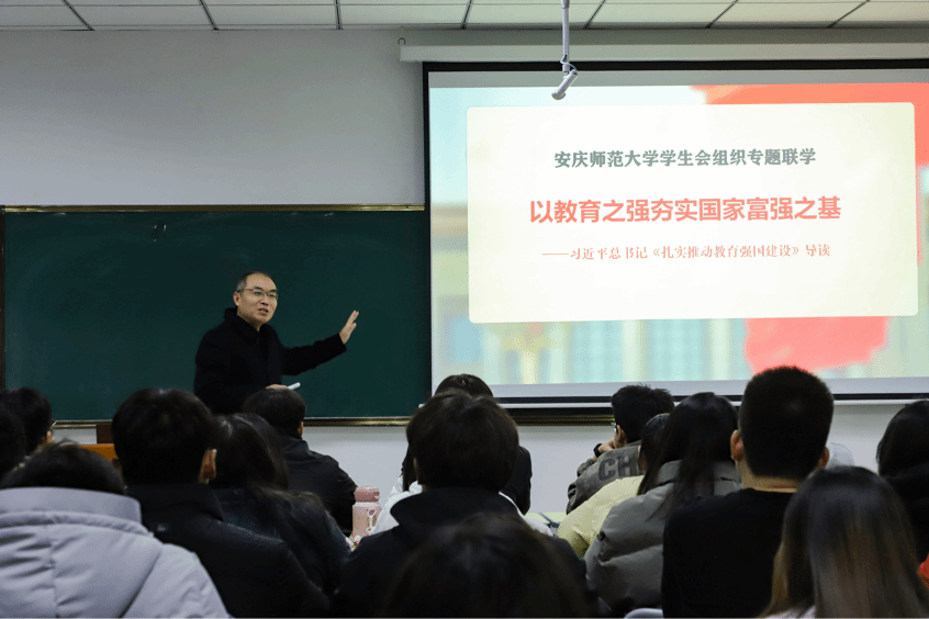 近日,学生会、研究生会组织开展专题联学,活动邀请安徽省委讲师团高端宣讲专家、安徽省高校示范思政课宣讲团成员、安徽省高校思想政治工作领军人才、马克思主义学院金文斌教授作专题导学,校团委班子成员,校学生会、研究会秘书长,校院两级学生会、研究生会主席团成员、学生骨干代表参加联学。