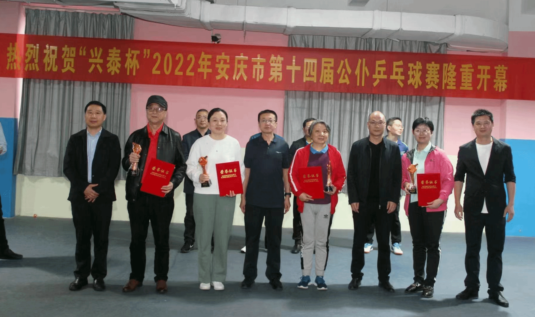 本次比赛由安庆市乒乓球协会主办,兴泰建设集团有限公司协办。报名队伍26支,参赛选手160余人,比赛分为小组赛、淘汰赛共64场比赛,太阳成官网参赛选手李义中、汪健、潘开颜、荀安华等四位选手不畏强手,奋力拼搏,取得佳绩,为太阳成官网争得了荣誉。