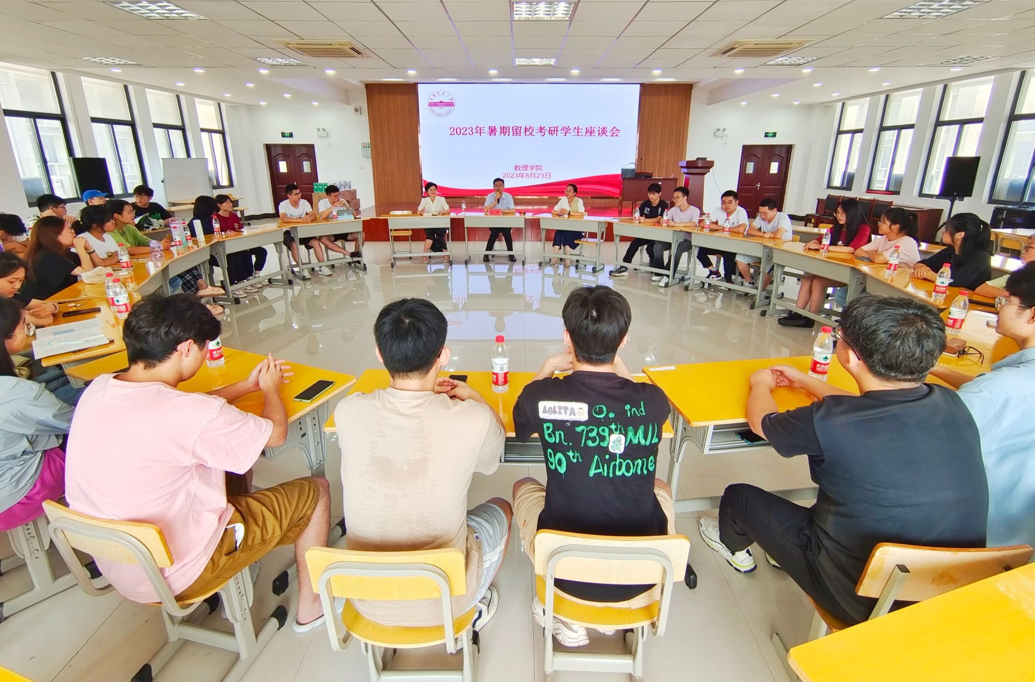 近日,数理学院于I楼401报告厅召开暑期留校考研学生座谈会,为考研学子加油助力,并送上学院精心准备的慰问品。学院党委书记陆健、副院长易明芳、党委副书记彭芳珍、2020级辅导员以及暑期留校考研学生代表参加座谈会。