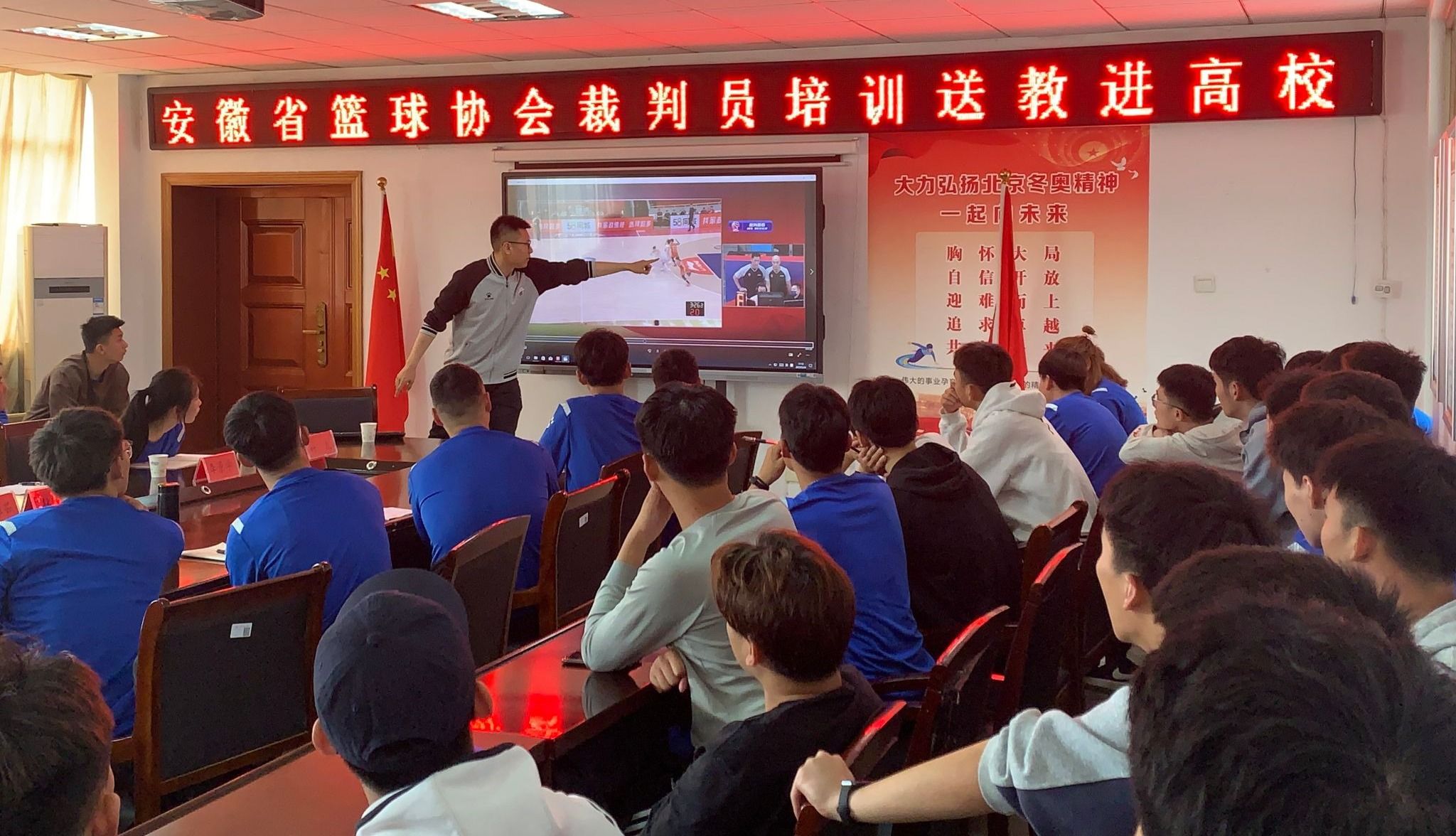 5月24日,安徽省球类运动管理中心、安徽省篮球协会来校开展裁判员培训送教进高校活动。省篮球协会副主席兼秘书长刘雅茹,省篮球协会副主席李景学,省篮球协会青少年发展部部长程丽,体育学院副院长林秋菊,以及省篮协裁判员培训讲师团成员、国家级裁判员叶凡、陈亚东出席开班仪式。会议由体育学院副院长王晓东主持。