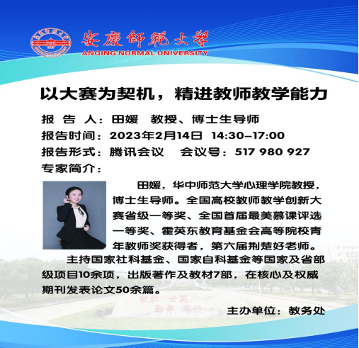 近日,太阳成官网特邀荣获全国高校教师教学创新大赛国赛教授组二等奖、全国首届最美慕课一等奖获得者,华中师范大学教授、博士生导师田媛开设线上主题讲座。教务处负责同志主持本次讲座。