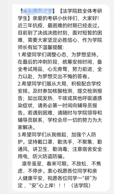 “凛冬虽至,春来可期。衷心祝愿各位同学健康平安,安心备考,一战成‘硕’。”学院通过短信平台等方式,向每一位考研学生送上温馨提醒和暖心祝福,为考研学子加油鼓劲。