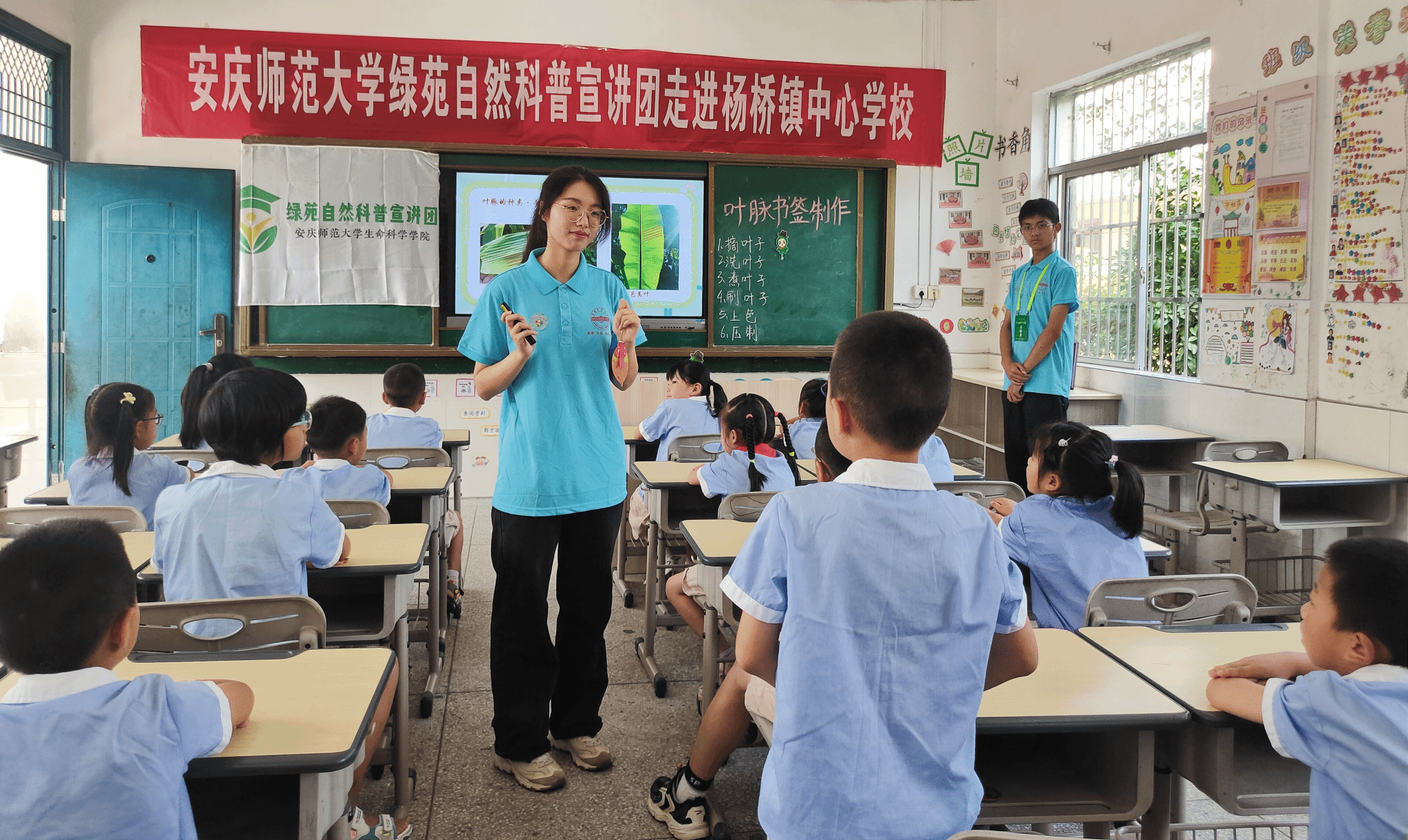 “你们都认识哪些树叶?”“这些叶片有什么区别?”“叶脉书签是怎样制作的?”……在杨桥镇中心学校,生物科学类专业2022(8)班的张雯菁当起了“小老师”,她以问题为引,运用PPT,将图片、文字和视频动画有机结合,介绍叶子的结构及作用、叶子如何茁壮成长、叶脉书签的制作方法等知识,用通俗易懂的语言将复杂的科学理论详细、生动的传授给学生。