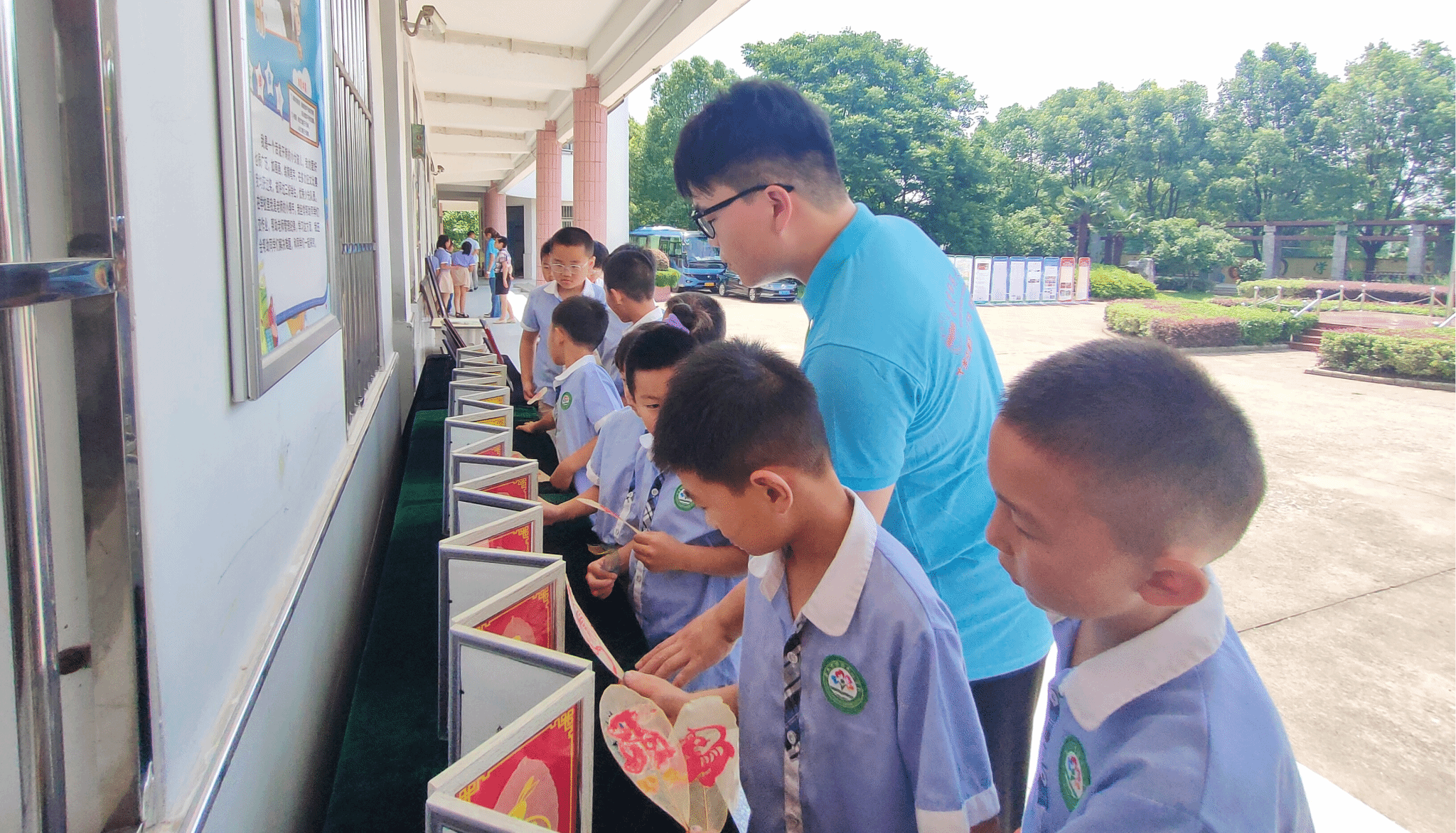 在实践地,这些作品被整齐地摆放在教室外的走廊上,不仅“赚”足了大家的眼球,而且能让来往学生随时随地观看学习。“十二生肖的叶脉剪纸画是怎么做的?”“这些蝴蝶标本是从哪里采集的?”“老师,这是什么植物?”面对“千奇百怪”的提问,讲解员何曦晨蹲下身,和小朋友们围在展品旁,向他们详细解答每件作品的材料准备、制作过程和创作理念,以便他们能够更好地理解作品的科学价值和所传达的内在意蕴。