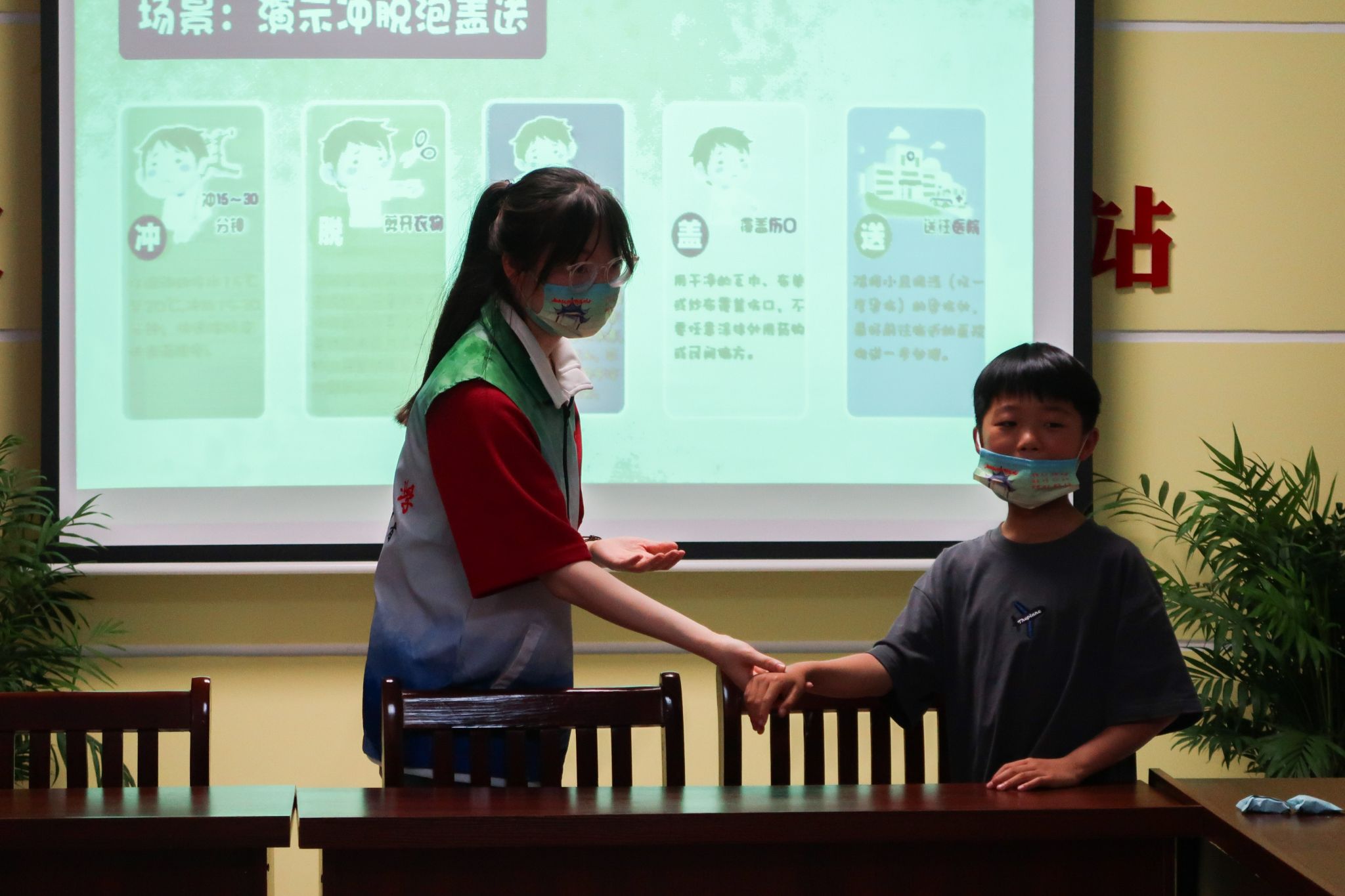 “远离烫烫小怪兽,牢记冲脱泡盖送。” 5月21日,学校星火志愿服务队联合青翼支教服务队走进安庆市大湖社区新时代文明实践站,为社区儿童开展“防烫伤”安全教育课堂,将知识“送”到儿童身边。