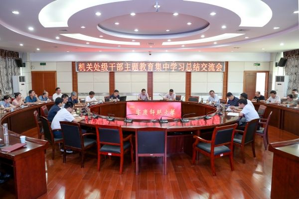 7月10日,机关党委在行政楼二楼大会议室召开机关处级干部主题教育集中学习总结交流会。机关党委书记何孔蛟主持会议。