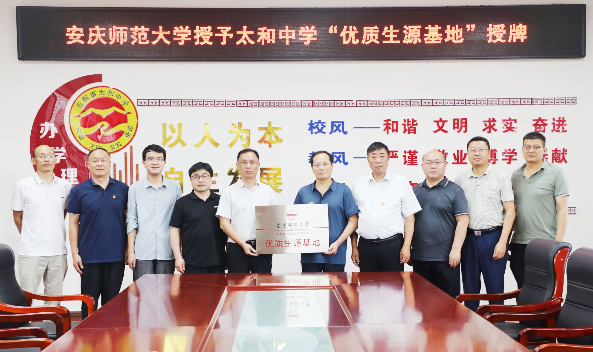 7月3日,马克思主义学院副院长余江舟带领学院教务和实验实训中心负责人一行前往太和中学参加“优质生源基地”签约及授牌仪式。太和中学党总支书记王永先、副校长王德民等学校党政领导班子成员参加授牌仪式。