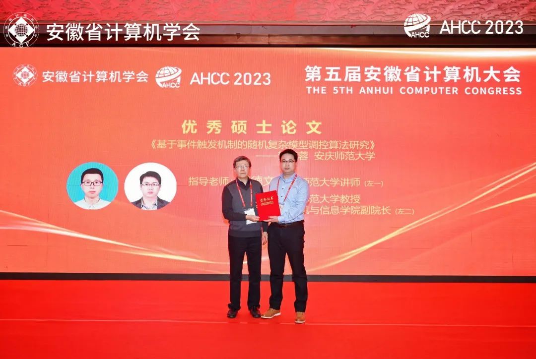 大会期间还颁发了2023年度各类奖项。计算机与信息学院教师操德文、吴健共同指导的硕士研究生贺芙蓉的学位论文“基于事件触发机制的随机复杂模型调控算法研究”获得优秀硕士论文奖。