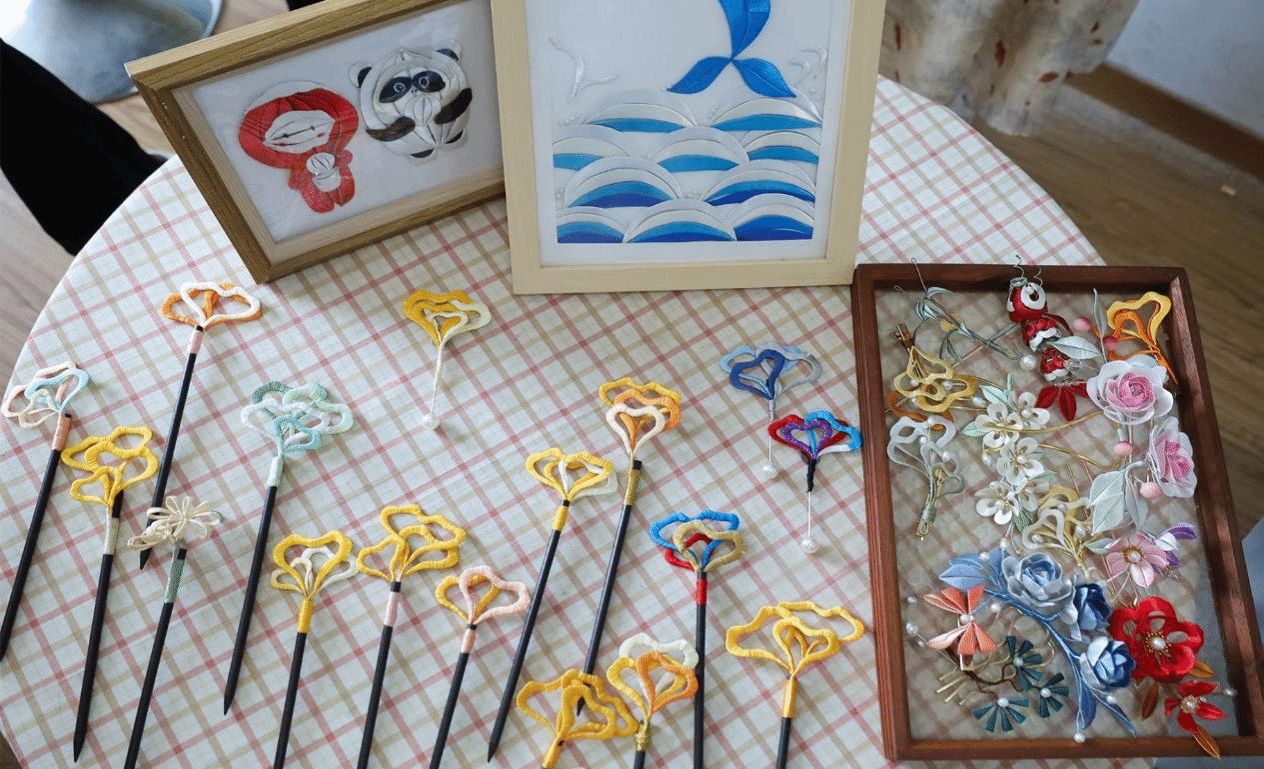 “缠线的时候要尽量把线捋平,这样可以避免露白,做出来的缠花也会更平整美观。”体育表演专业2022级(2)班的王博愉站在圆桌旁,化身“小老师”,向学生们示范缠花的制作步骤。银杏发簪、雏菊胸针、蝴蝶发夹……在“小老师”的指导下,学生们纷纷完成了精美缠花的制作。