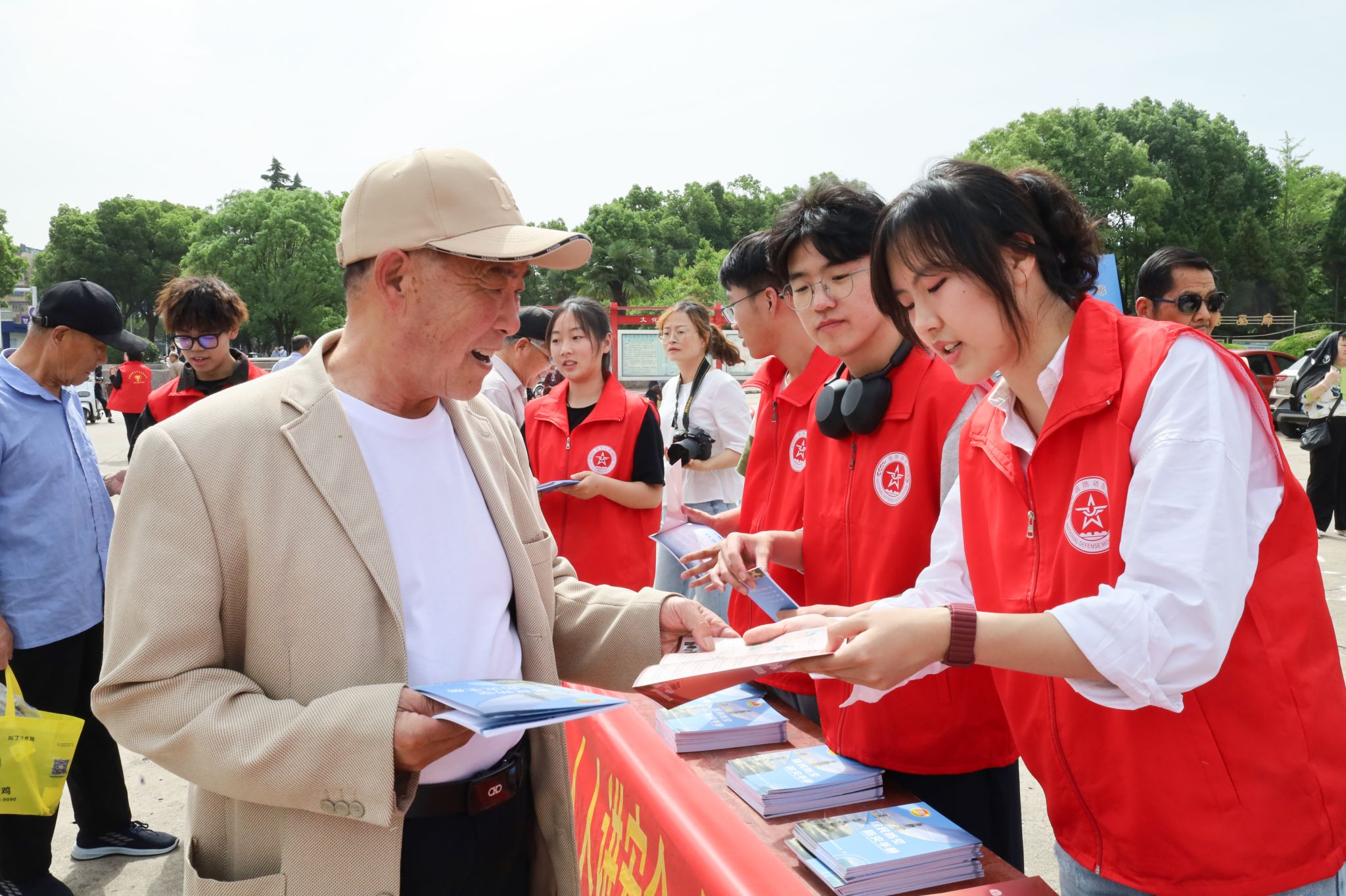 数理学院“微爱”志愿服务队7名学生进行宣讲。两张长木桌上摆放着制作精美的国防动员折页、人民防空折页、居民防空防灾手册等宣传品。队员们依次将手册分发给面前的群众,细致讲解手册内容。“地震是地壳快速释放能量时产生地震波,从而引起振动的自然现象。在室外面对地震时,我们要尽量躲到空旷的地方;在室内时,要在坚硬物体下躲避,等待专业团队的救援。”本次活动负责人、信息与计算科学专业2023(2)班的宋博文向市民们科普。