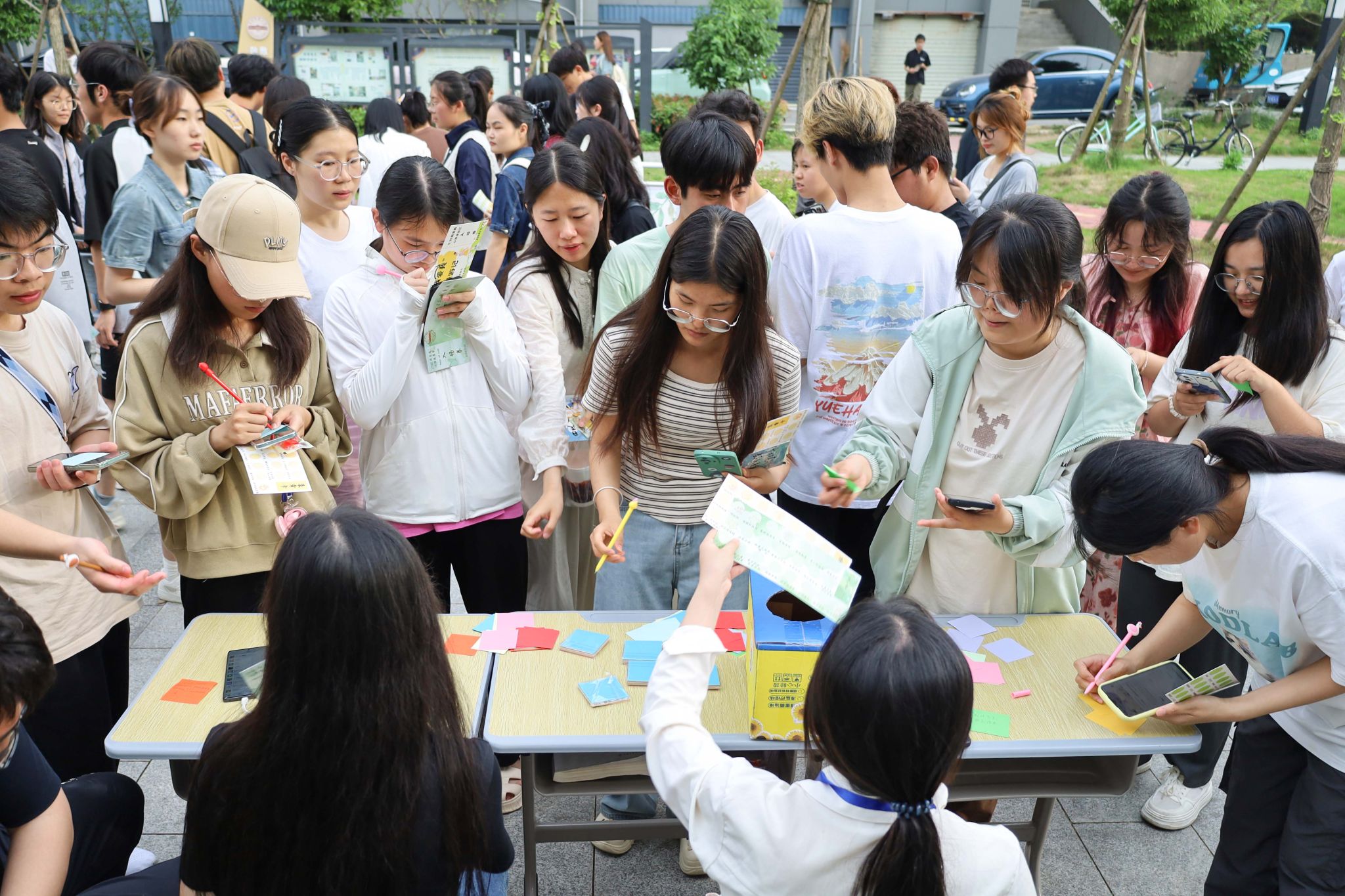 “压花书签”摊位前人头攒动,法学类专业2023(1)班的葛芯怡手持一个植物标本“举棋不定”,在工作人员和周围参与学生的帮助下,她成功将透明书签封口并匹配流苏挂上展示台。“这对我来说是一次全新的体验,在同学们的帮助下,我鼓起勇气去尝试,挑战了自我。”葛芯怡感叹,自己性格非常腼腆,总是害怕犯错,但今天的活动让她看见了与平常不同的自己。