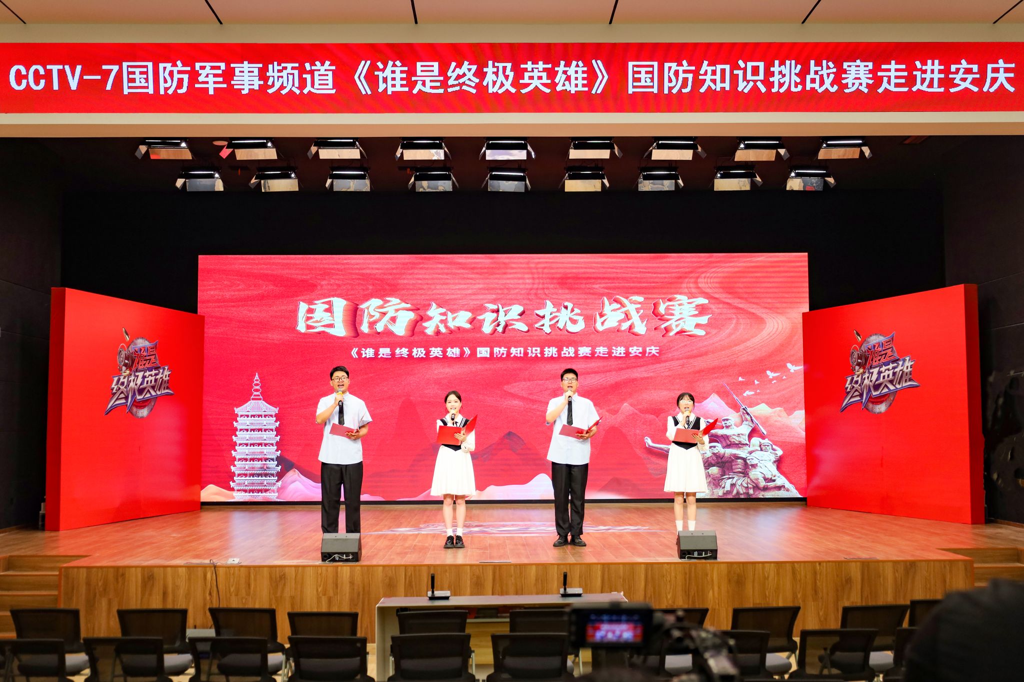 “让子孙后代享受前人披荆斩棘的幸福吧!”庄严且铿锵的声音响彻安庆市绿地实验学校报告厅,四名宣讲人正于镜头前深情朗诵。人文学院敬敷青年党史宣讲团携朗诵《青春年代》协助拍摄CCTV-7国防军事频道《谁是终极英雄》节目录制。