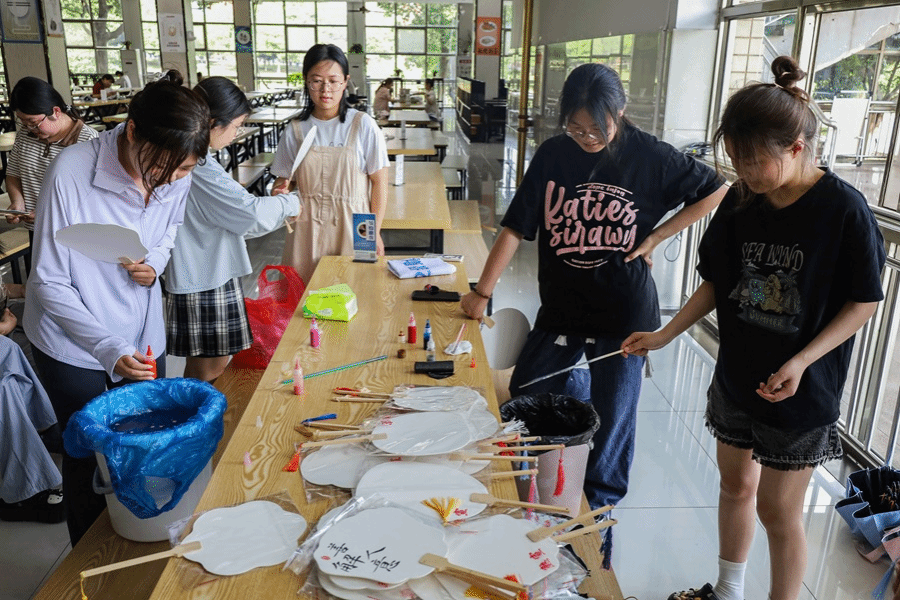 “漆扇使用的是漆艺中的‘漂漆’技法,利用了漆不溶于水的特点,辅以点、甩、弹、划等手法,在水面绘出图案效果制作而成。”财务管理专业2022(3)班的汪子奇一边往水中滴入色漆一边向围观的学生介绍到。她表示,漆艺作为非物质文化遗产,是中国传统工艺文化的重要组成部分,漆艺历史悠久、技艺独特,具有深厚的文化内涵和艺术价值。