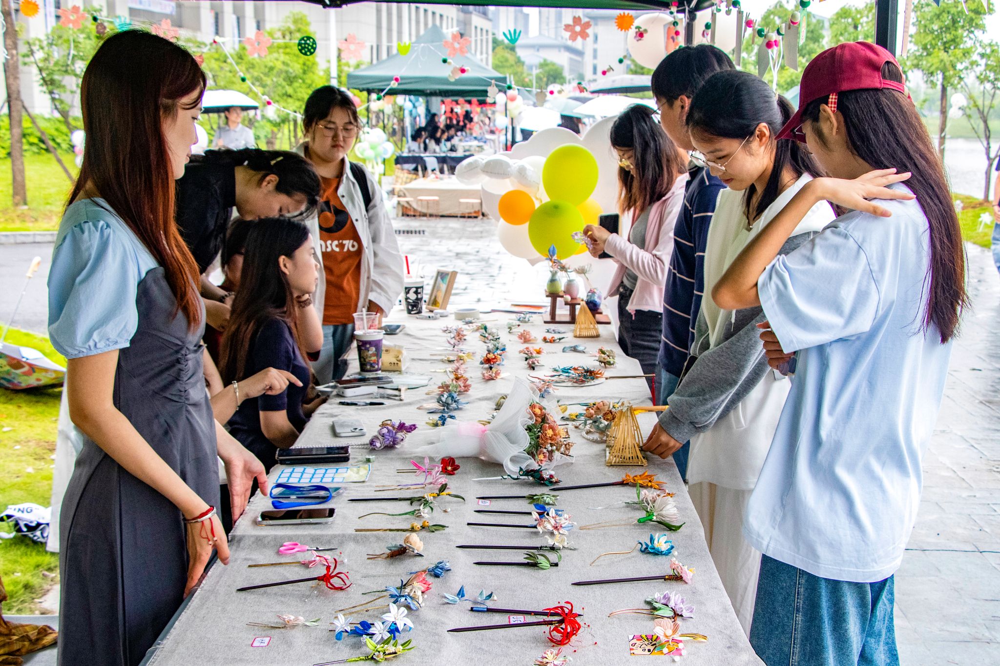 在双龙湖畔的草坪上,摆放着10余件利用人台进行展示的纯色礼服。艺术节“打卡”之旅刚开启,这组礼服的照片便“刷屏”众多学生的朋友圈。“这是由我们设计的作品,我很高兴看到它们被大家所喜爱。”服装与服饰设计专业2022级留学生阿玛尼表示,这是她第二次在学校参与湖畔艺术节,对于自己的作品能在艺术节上展出,她感到十分自豪。