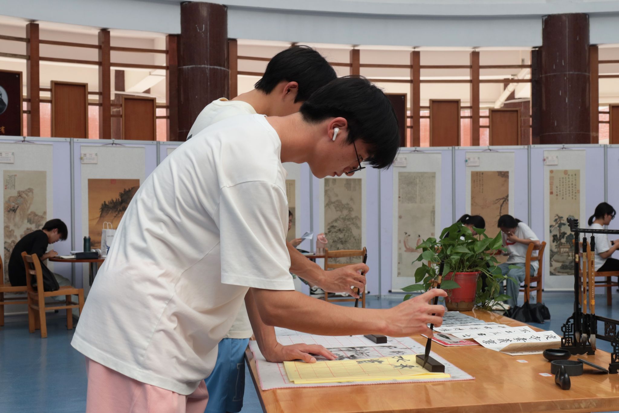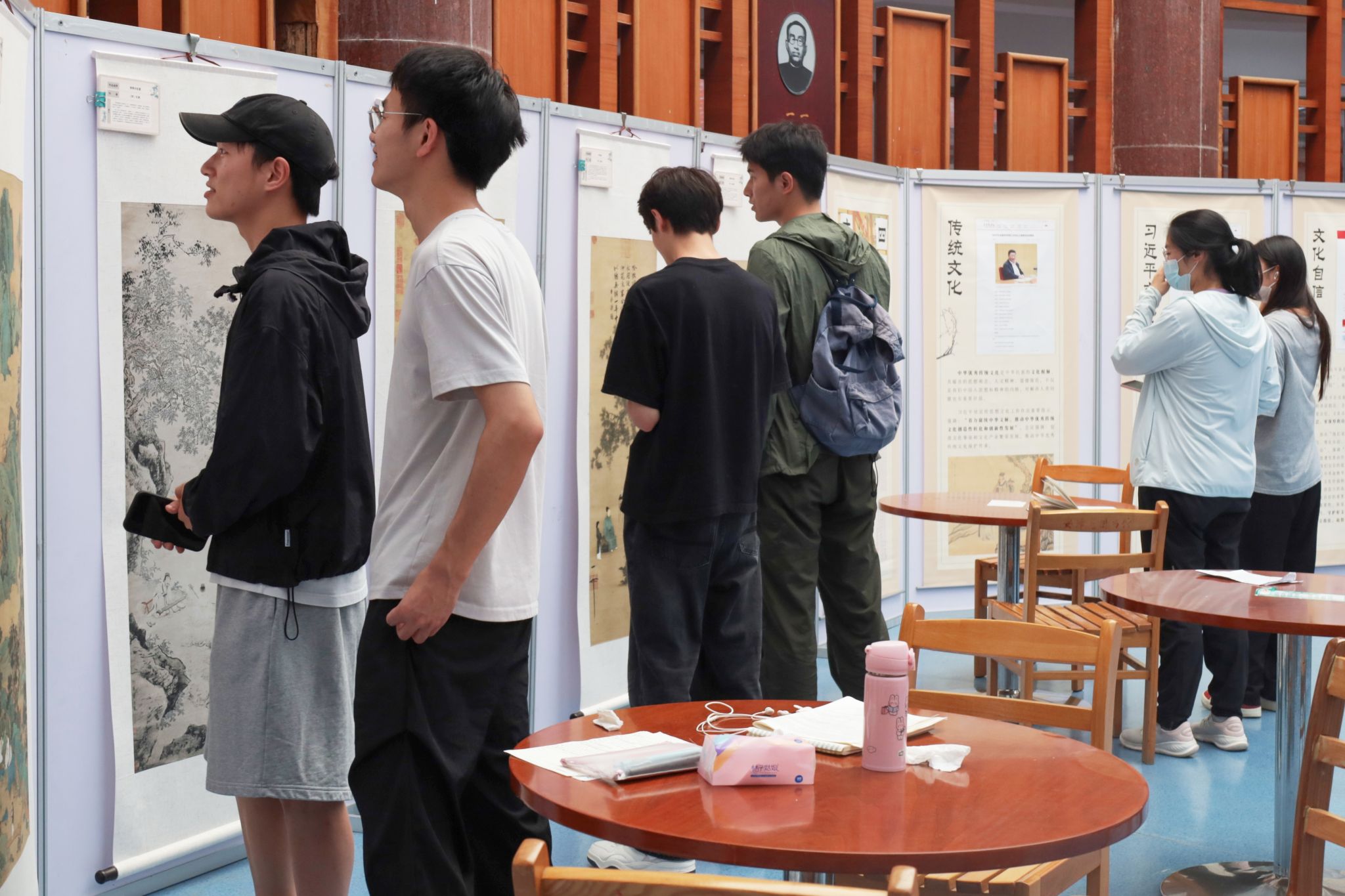 前来观展的学生驻足于一幅幅艺术作品前,尝试解读其中的意境和韵味。“作者以琴声为主题,巧妙地用笔墨刻画出‘此时无声胜有声’的音乐意境。”新闻传播学类专业2023(5)班的李安琪表示,宋徽宗的《听琴图》给她留下了深刻的印象。“我在欣赏这些画作时,就像是在和古代艺术家们进行一场跨越时空的对话。”李安琪如是说。