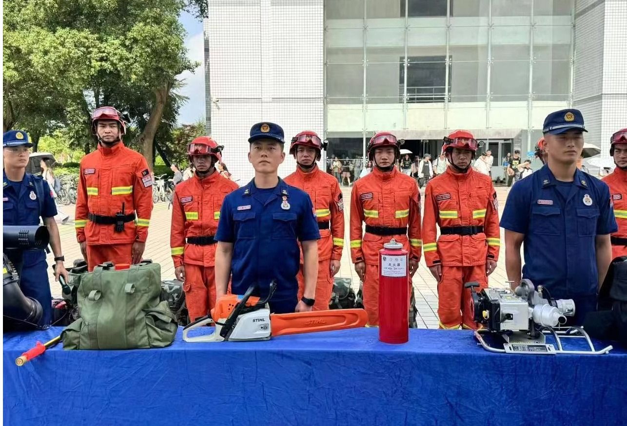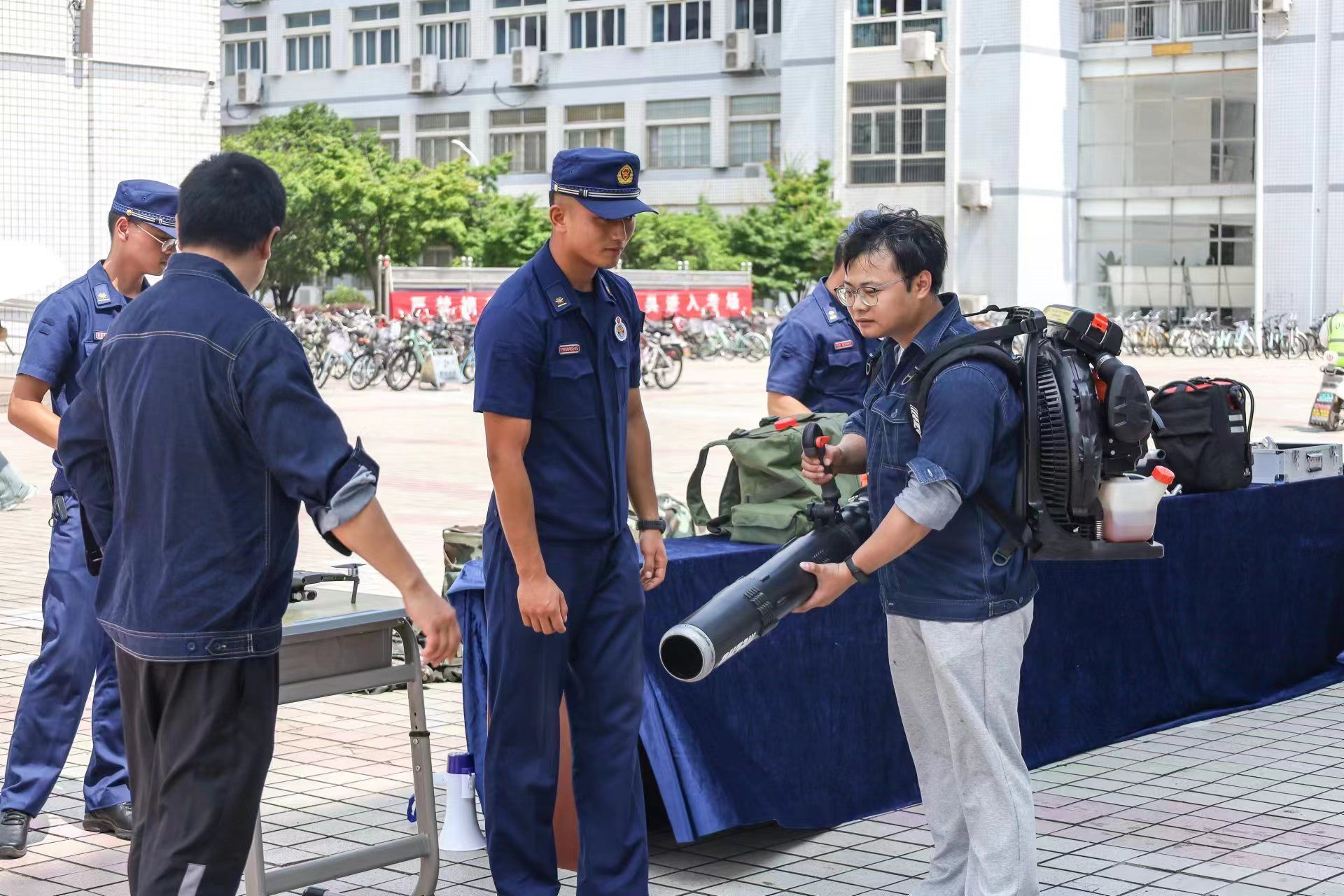 应急装备观摩区是整个活动的亮点之一,参加活动的学生在这里亲身了解体验便携式消防水泵、巡查无人机、风力灭火机等应急救援装备。 “这台森林消防抽水泵和可移动折叠应急救灾储水囊吸引了我,我已经迫不及待尝试,高水压的冲击使我的身体向前倾斜,让我感受到了消防水枪的灭火威力。”地理科学专业2023(2)班的杨静茹谈到自己体验装备的感受。