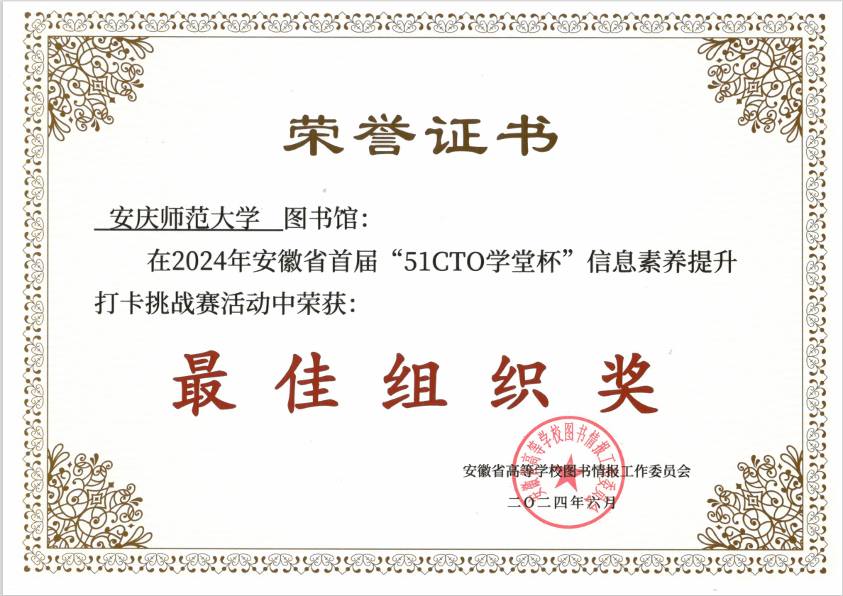 由安徽省高等学校图书情报工作委员会主办的安徽省首届“51CTO 学堂杯”信息素养提升打卡挑战赛日前圆满结束。本次大赛中太阳成官网董雨欣同学荣获一等奖,李树雪同学荣获二等奖,汪涛、张庭、张雨涵、俞浩然同学荣获三等奖,戴静荣获“优秀指导教师奖”。在此次比赛中太阳成官网参赛人数和获奖成绩在全省各院校中均居前列,图书馆获得“最佳组织奖”。
