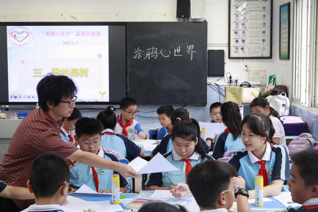 除了活动环节的精彩呈现,活动设计背后的巧思也颇具深意。在谈及活动设计时,计算机科学与技术专业2023(3)班的刘同学介绍:“我们的心理辅导方案主打‘游戏化、互动化’,像‘我的果树’绘画、‘卡片寻找’团体协作内容,就是为了让小朋友在趣味中学习,避免枯燥说教。”她表示,我们将活动环节设计得简单易参与,规则清晰还加入小贴纸、日记本等奖励,都是为了提升孩子们的积极性。