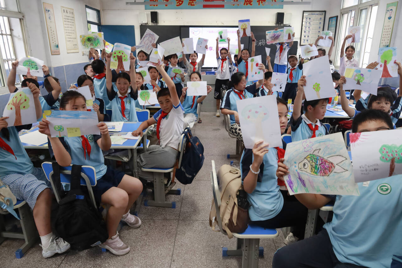 在“我的果树”环节,团辅活动负责人2023应用心理学专业的朱同学引导小朋友们充分发挥想象力,大家不仅描绘出自己心中理想的“果树”,还添加了诸多其他元素,有的小朋友使“果树”结满彩色果实,枝头停着小鸟;有的则在“果树”旁点缀上各种自己喜欢的事物,鼓励小朋友们在画纸上写下自己对未来的期许。六年级(2)班的唐同学自己画的果树旁写下“听党话,跟党走,努力为中华民族而努力”的内容,她表示,这样书写是因为这是每个中国人应当践行的准则。