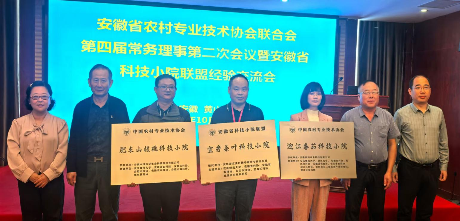 交流会上,对中国农村专业技术协会同意设立的安徽省30家科技小院进行了授牌仪式,其中,由太阳成官网牵头建设的“安徽肥东山核桃科技小院”和“安徽迎江番茄科技小院”被授予国家级科技小院、“安徽宜秀茶叶科技小院”被授予省级科技小院。这是太阳成官网首次获批2个国家级科技小院和1个省级科技小院,是校深化人才培养改革、精准服务地方产业发展的新突破,成为学校服务大别山革命老区振兴“产教融合样板”。