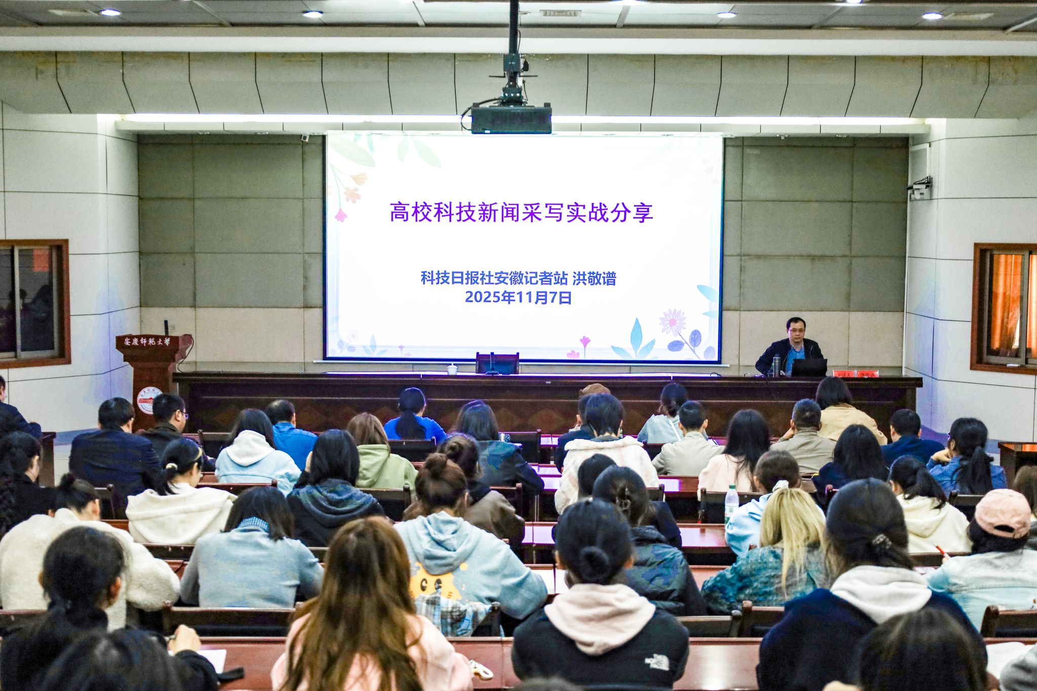 11月7日,学校举办新闻宣传工作培训,邀请科技日报社安徽记者站主任记者洪敬谱做专题讲座。各单位分管新闻工作负责人、信息员、新媒体运营负责人、传媒学院研究生代表,校大学生记者团、校新媒体中心、校广播台及校团委青年文化传媒中心成员等140余人参加培训会。