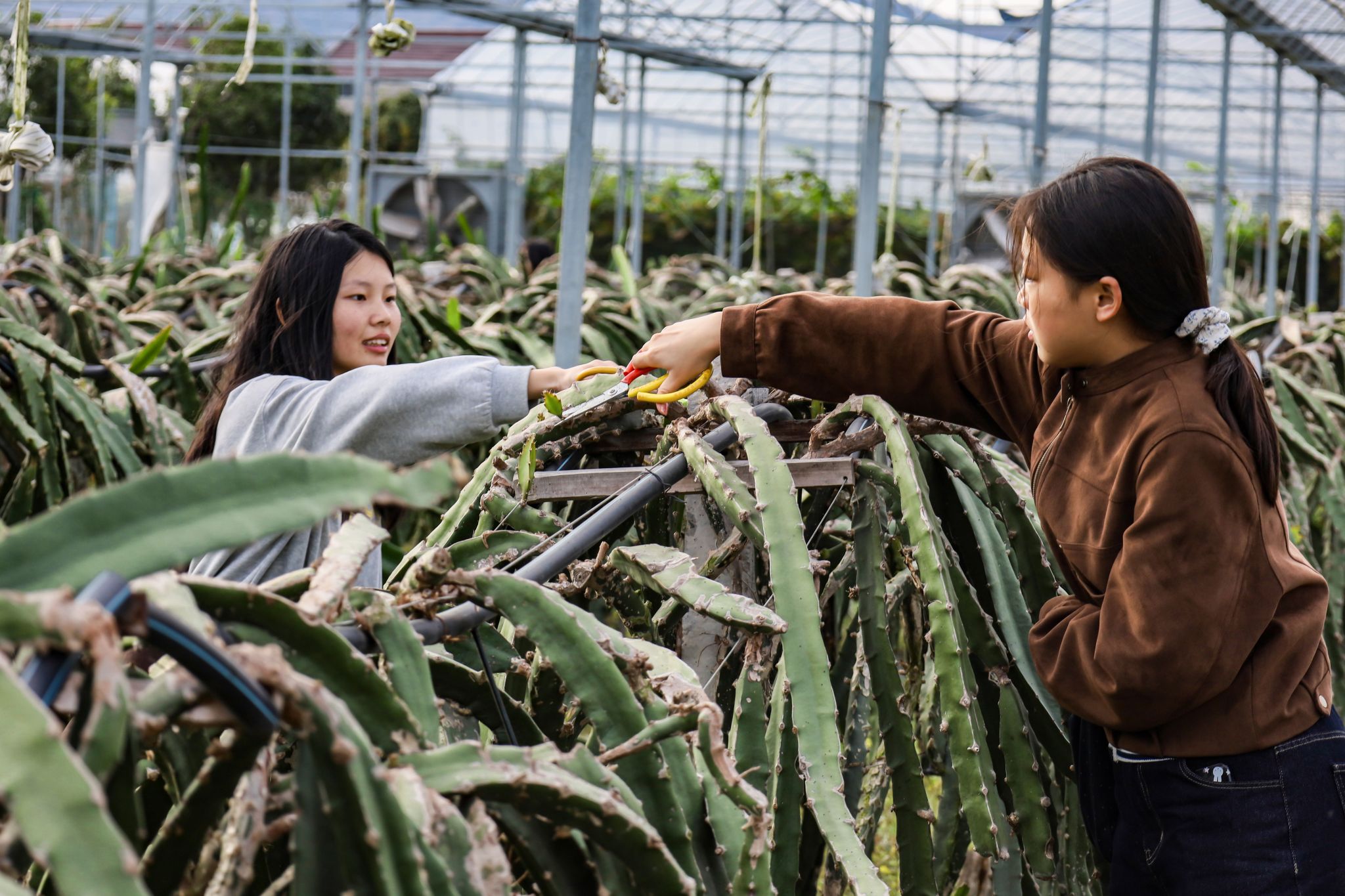 转入火龙果种植区,学生在技术员的指导下手持剪刀,小心翼翼地将火龙果茎上的嫩芽连着根部一起修剪掉。“火龙果植株上有刺,大家注意安全”,技术员细心提醒。物流管理2024(1)班的陶怡慧在亲手操作后分享:“原本以为火龙果长在高大树木上,没想到植株像芦荟,枝条垂坠而下。”她表示,这次活动既长知识又有趣,收获特别大。