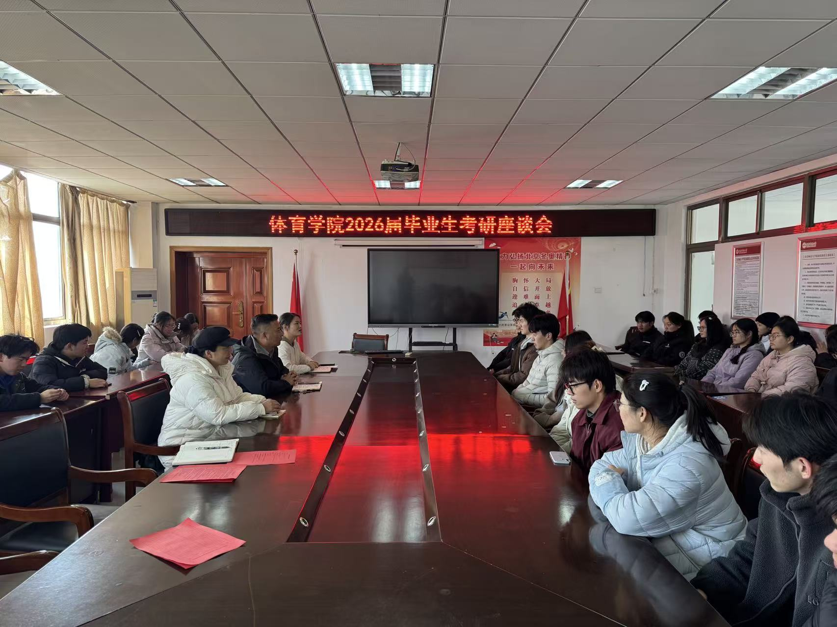 12月16日,体育学院在学院三楼会议室召开2026届毕业生考研座谈会,学院党委副书记杜百忍、学院心理专管老师方芳、毕业班辅导员及2026届考研学子代表参会。