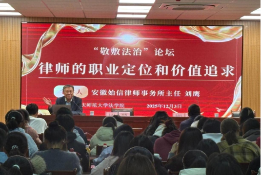 12月3日,法学院特邀安徽始信律师事务所主任、学校池州校友分会会长刘鹰作客“敬敷法治”论坛,围绕“律师的职业定位与价值追求”主题为学院师生作专题报告。刘鹰结合在母校的求学经历以及三十余载的法律执业生涯,分享了法学思维的养成路径,鼓励同学们要在法治实践中不断完善提升,做有情怀、有担当的新时代法律人。与会学生纷纷表示,本场报告既有理论高度,又有实践深度,更有情感温度,让人深切感受到法律人应有的情怀与担当。