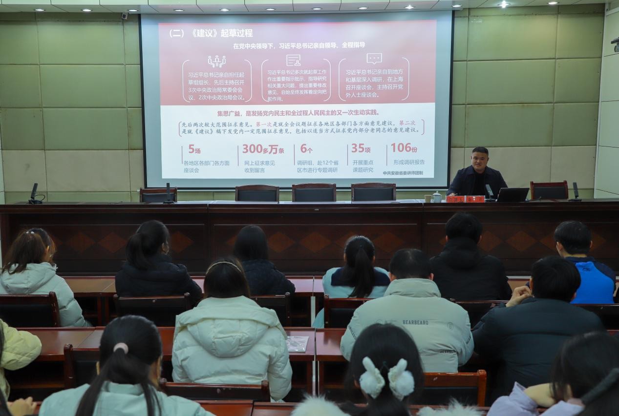 1月6日下午,“举旗帜·送理论”学习贯彻党的二十届四中全会精神省级层面专题宣讲活动在行政楼一楼会议室举行。安徽省委讲师团理论宣讲专家、安徽医科大学马克思主义学院党委副书记余立教授作专题辅导。学校师生代表140余人参会。