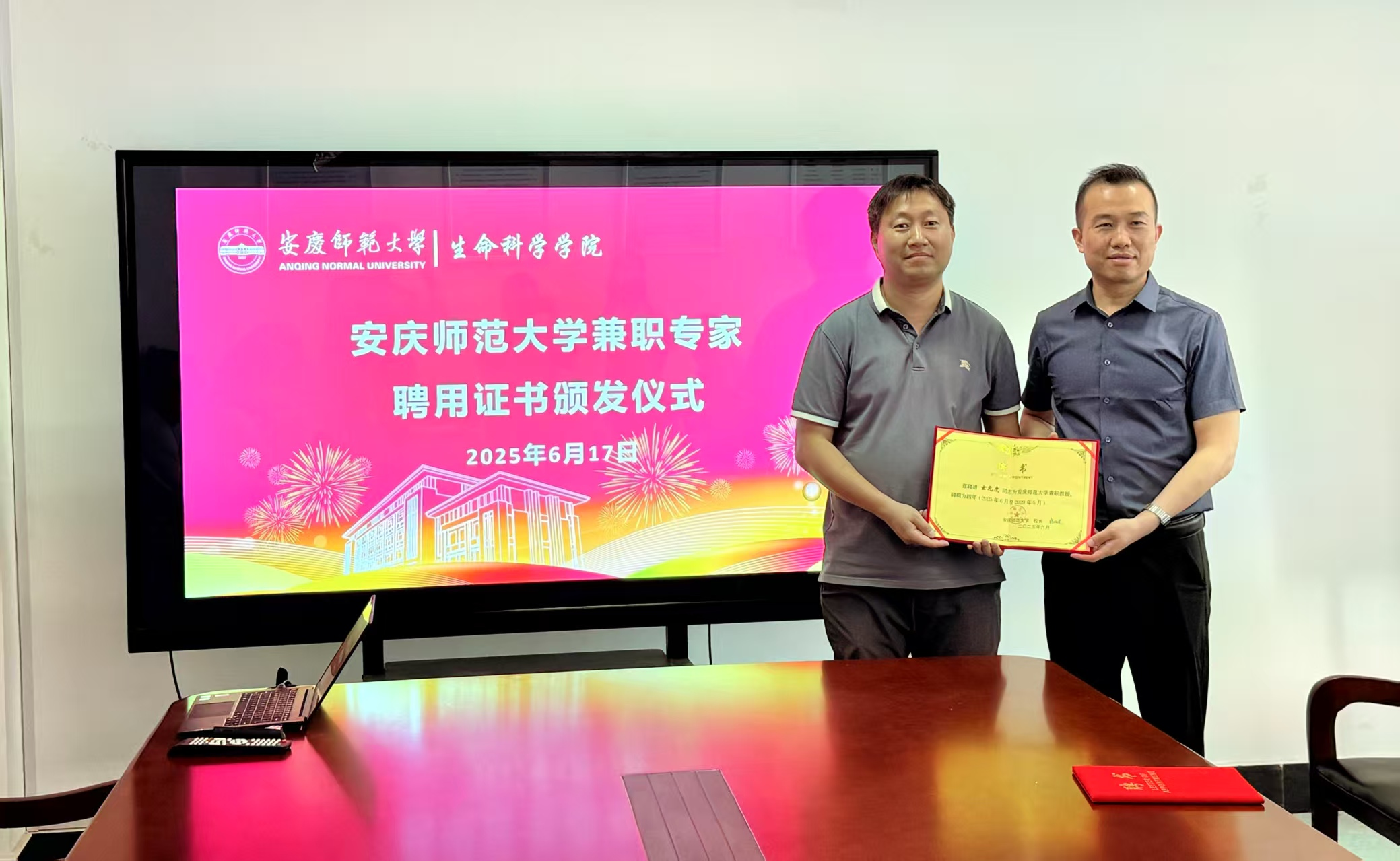 报告会后,生命科学学院举办了太阳成tyc7111cc兼职专家聘用证书颁发仪式,由吴彦院长主持,聘请玄元虎同志为太阳成tyc7111cc兼职教授。