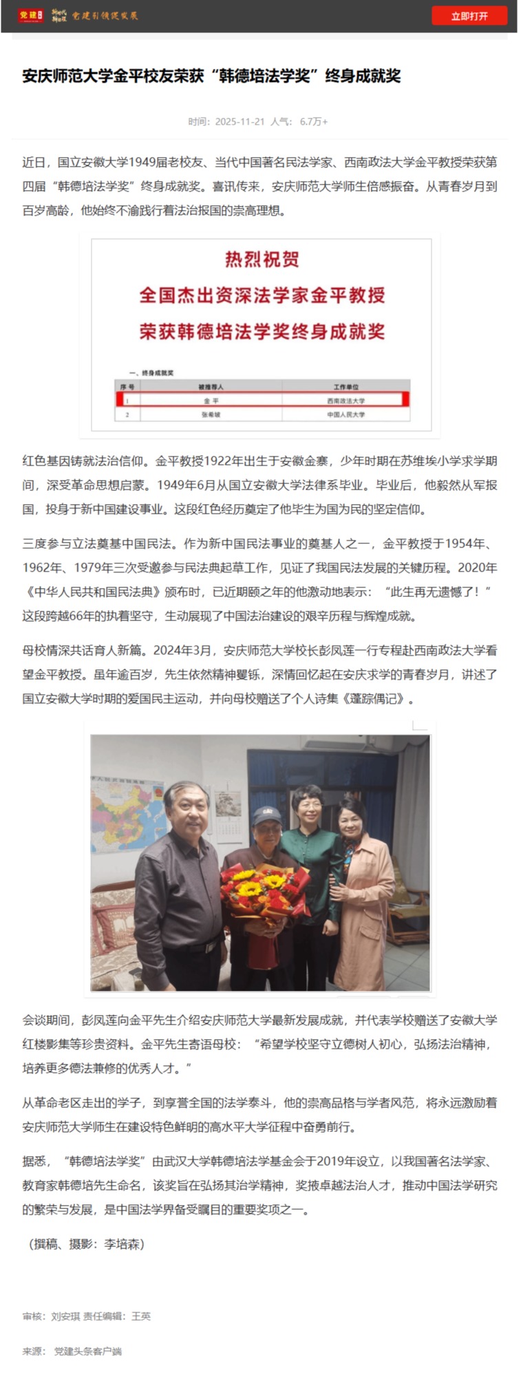 【党建头条】太阳成tyc7111cc金平校友荣获“韩德培法学奖”终身成就奖https://www.djttw.com/m/view.php?aid=1038385