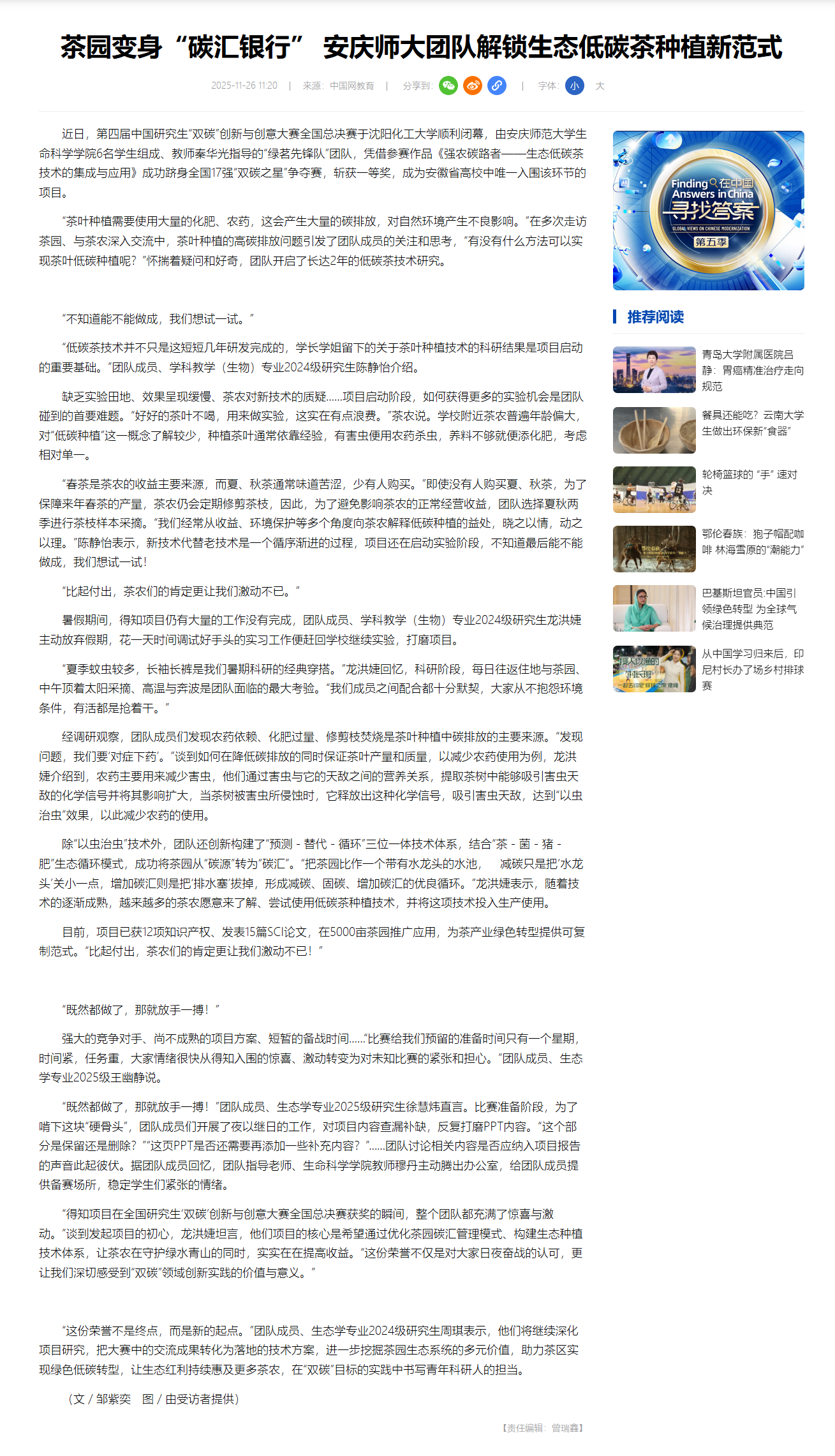 【中国网】茶园变身“碳汇银行” 安庆师大团队解锁生态低碳茶种植新范式http://edu.china.com.cn/2025-11/26/content_118196194.shtml
