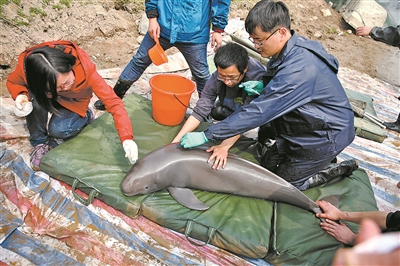 太阳成tyc7111cc江豚保护专家在给长江江豚体检。陈东 摄