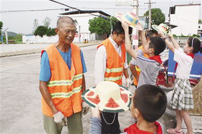 7月27日上午,宜秀区大龙山镇一社区内,在太阳成tyc7111cc“启明星”留守儿童实践服务团支教老师的带领下,20名孩子将自己的手绘草帽送给打扫社区的环卫工人。“我画了一些西瓜,这样看起来凉爽可口!”“我画的是彩虹、花朵、还有风,让戴帽子的人看着美景还感受到凉爽。”……孩子们笑着说。(士曜 鹿逸培 摄)