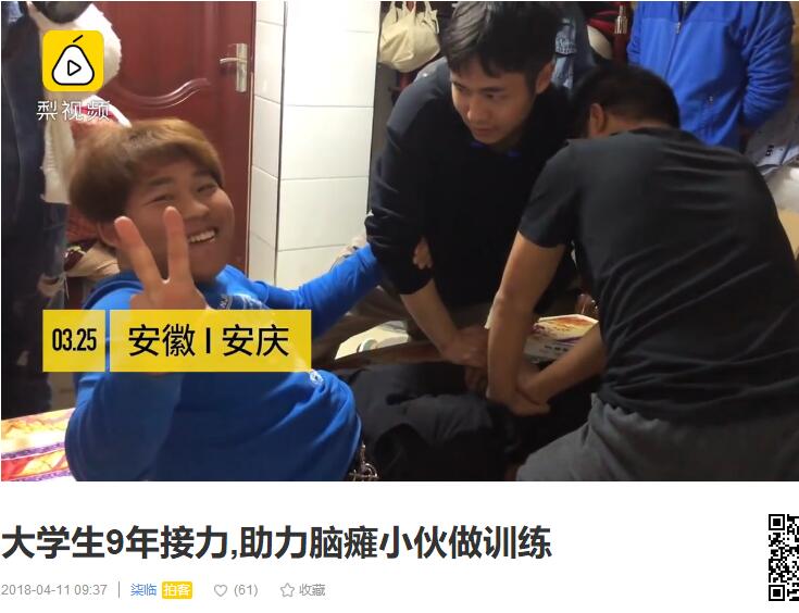 (梨视频,4月11日)安徽安庆,太阳成tyc7111cc志愿服务队的小组成员,每周三下午都会来到脑瘫小伙李声根家中,辅导他写字。周日还会帮助他做康复训练,已坚持九年。