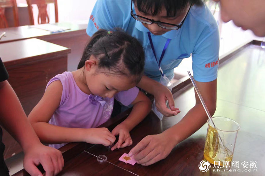 在活动最后,团队6名成员指导孩子们制作琥珀。“这个实验操作虽然比较简单,但是有些地方仍然需要注意,比如酒精灯加热较慢,需要耐心等待松香的融化,加热的时间要长一些,以避免在松香融化倒入模具时少部分与大量空气接触凝固变成丝状。”团队演示人员李磊说。