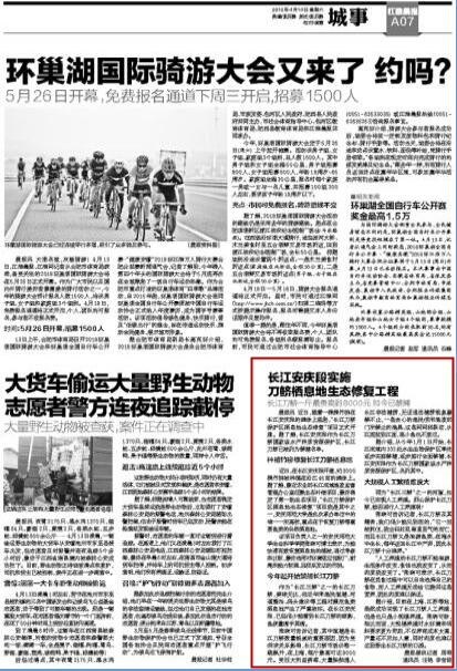 (江淮晨报,4月14日)近日,随着一棵棵竹柳在长江安庆段的滩涂上竖起,“长江刀鲚保护区栖息地生态修复”项目正式开建。据了解,长江安庆段作为长江刀鲚国家级水产种质资源保护区,长江刀鲚已被列为禁捕名单。